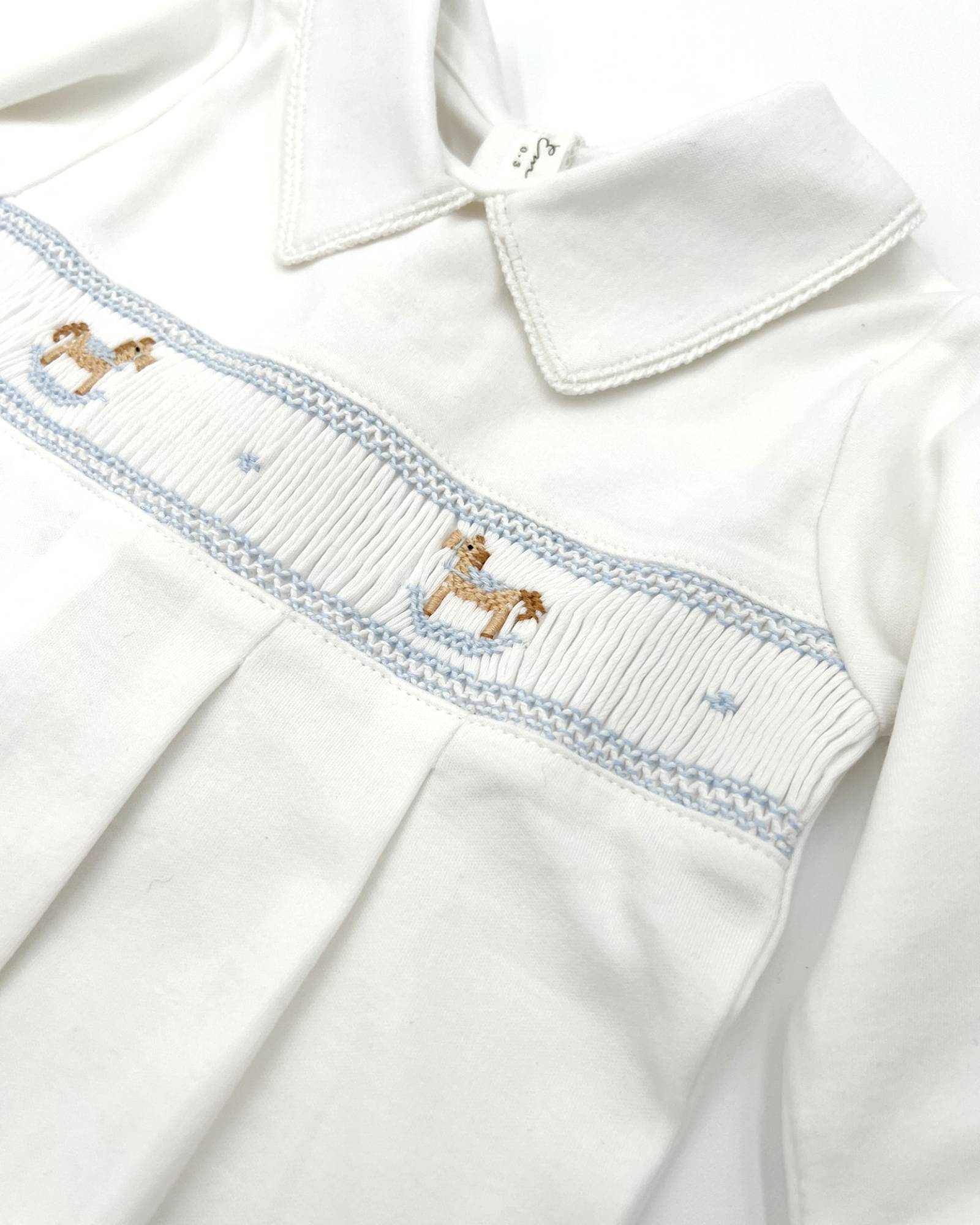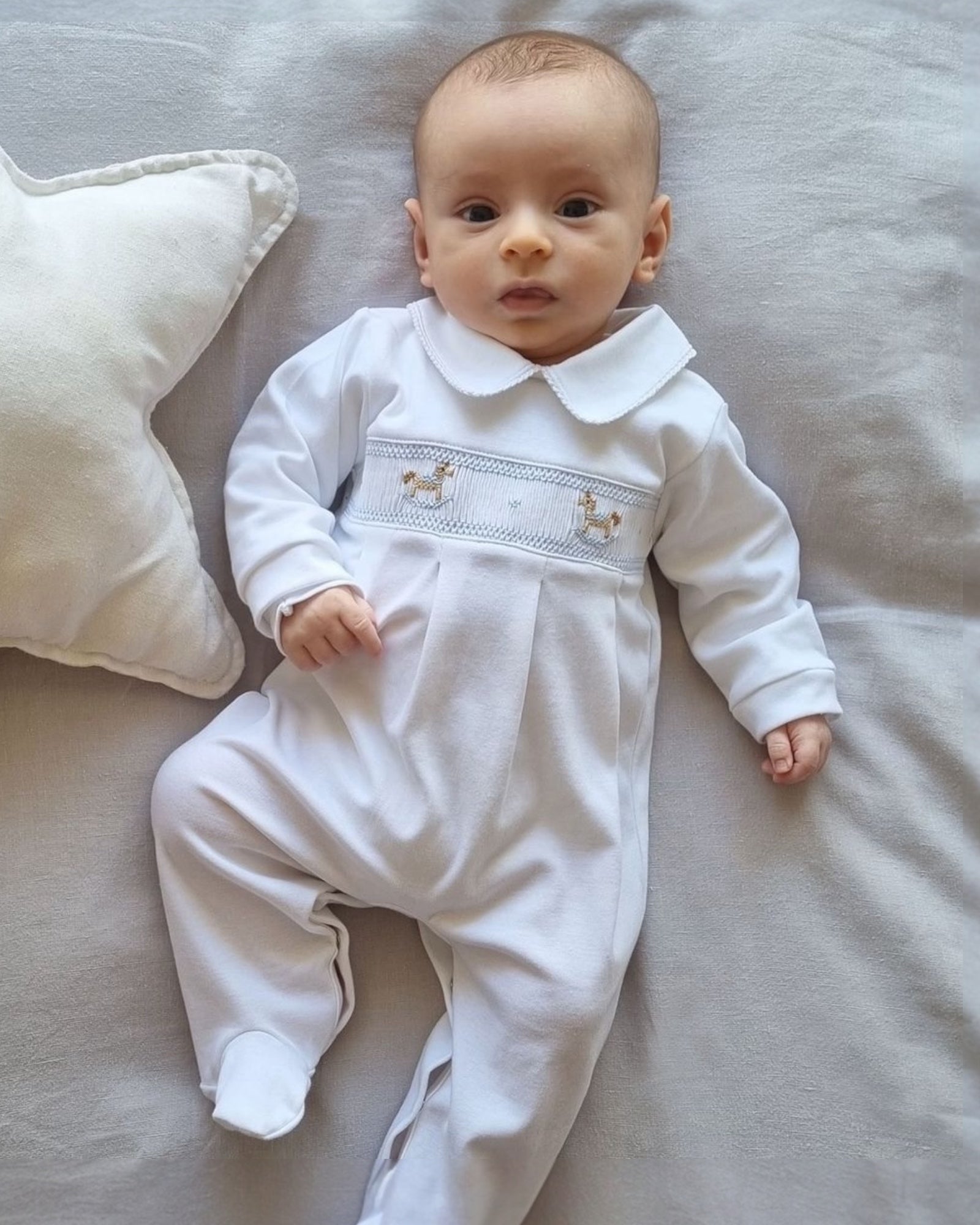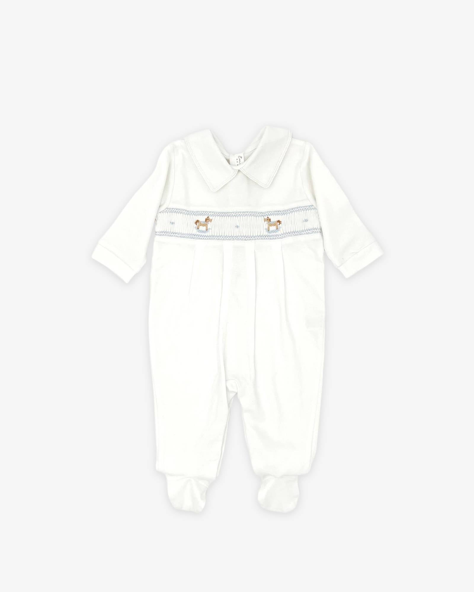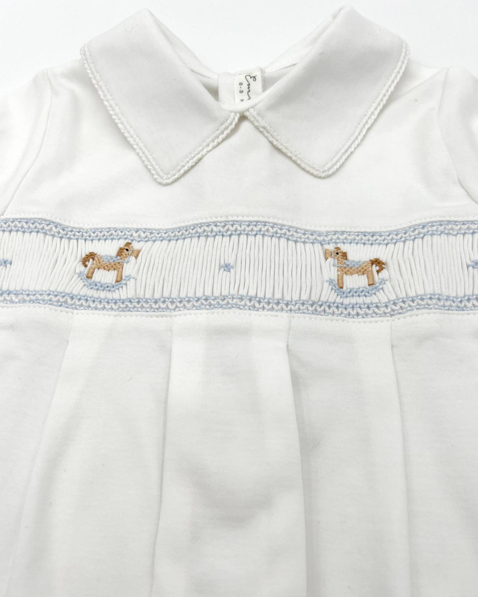 Expertly crafted from 100% Pima cotton in Peru, this white baby pajama features adorable hand-embroidered brown horses and a blue pattern. Available from 0 - 6 months.