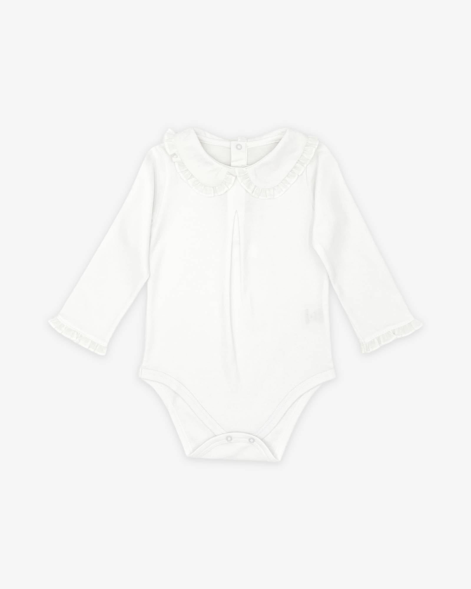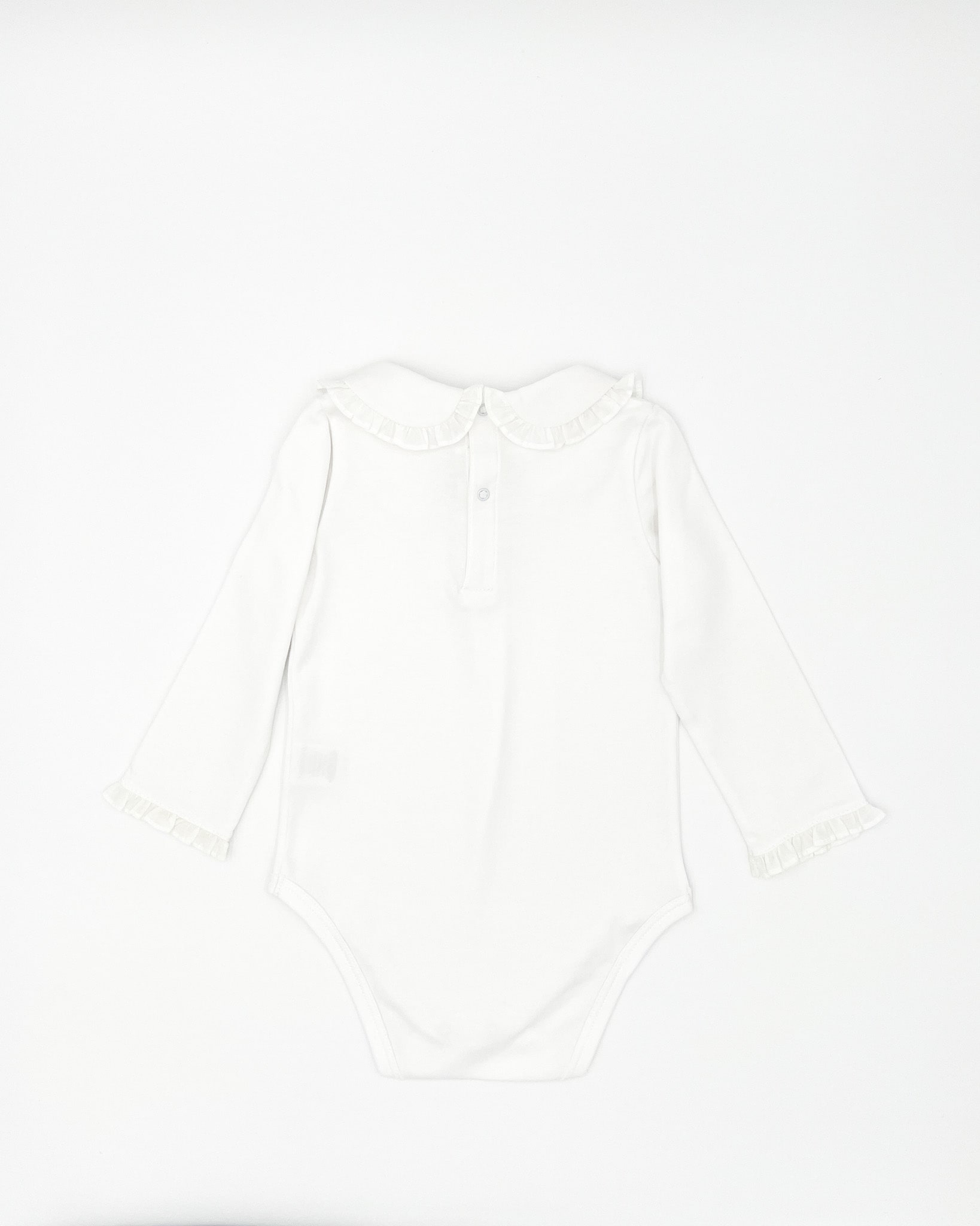 Long sleeve bodysuit with ruffled collar and sleeves made with 100% Pima cotton.