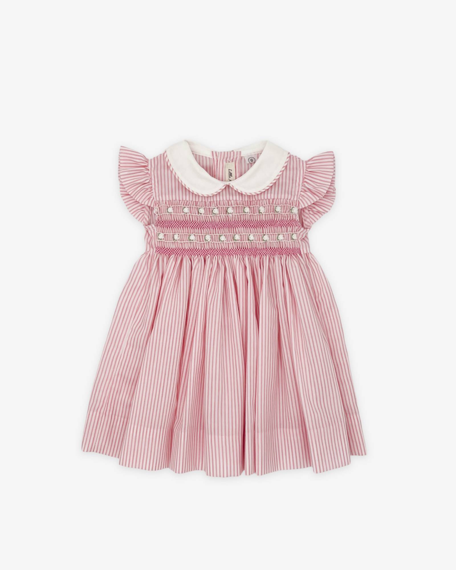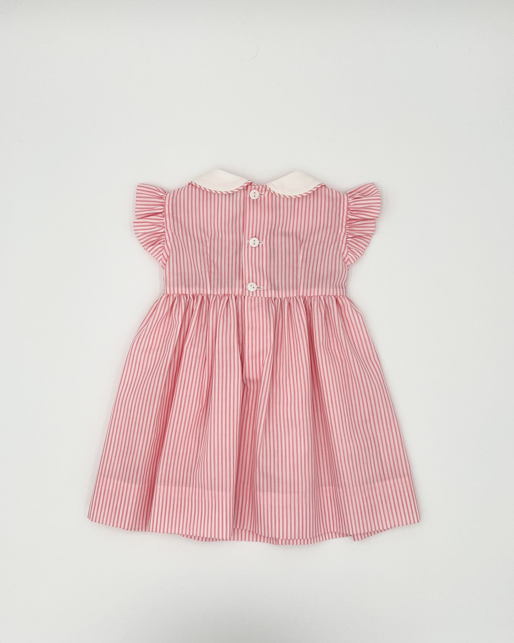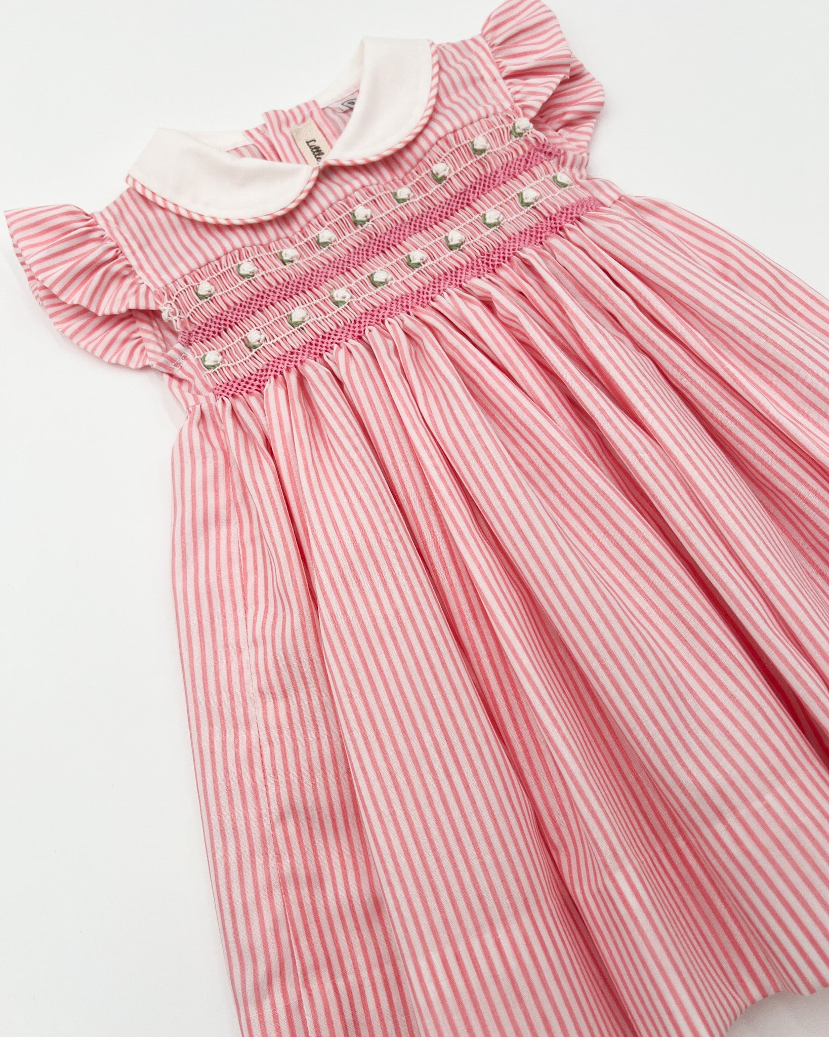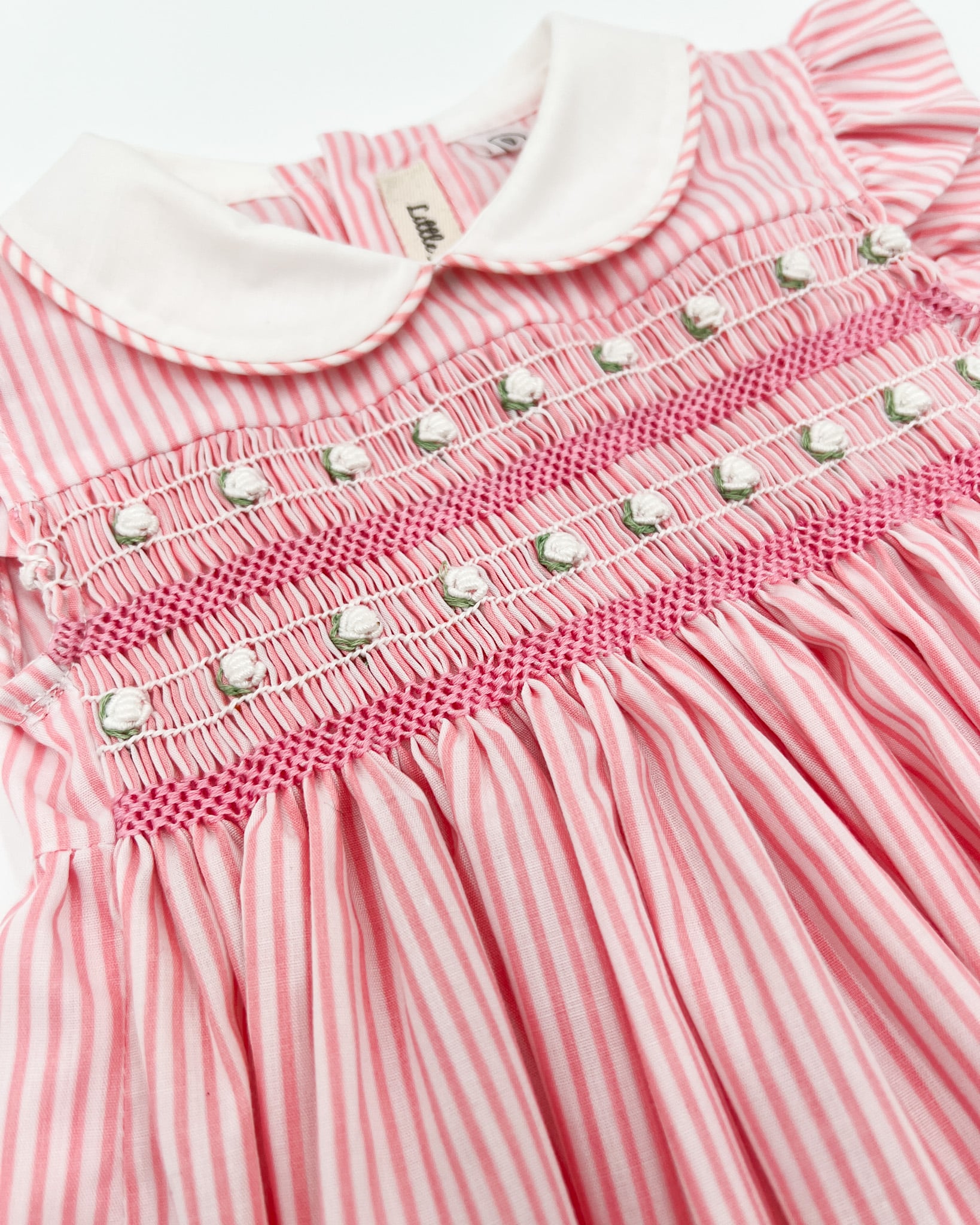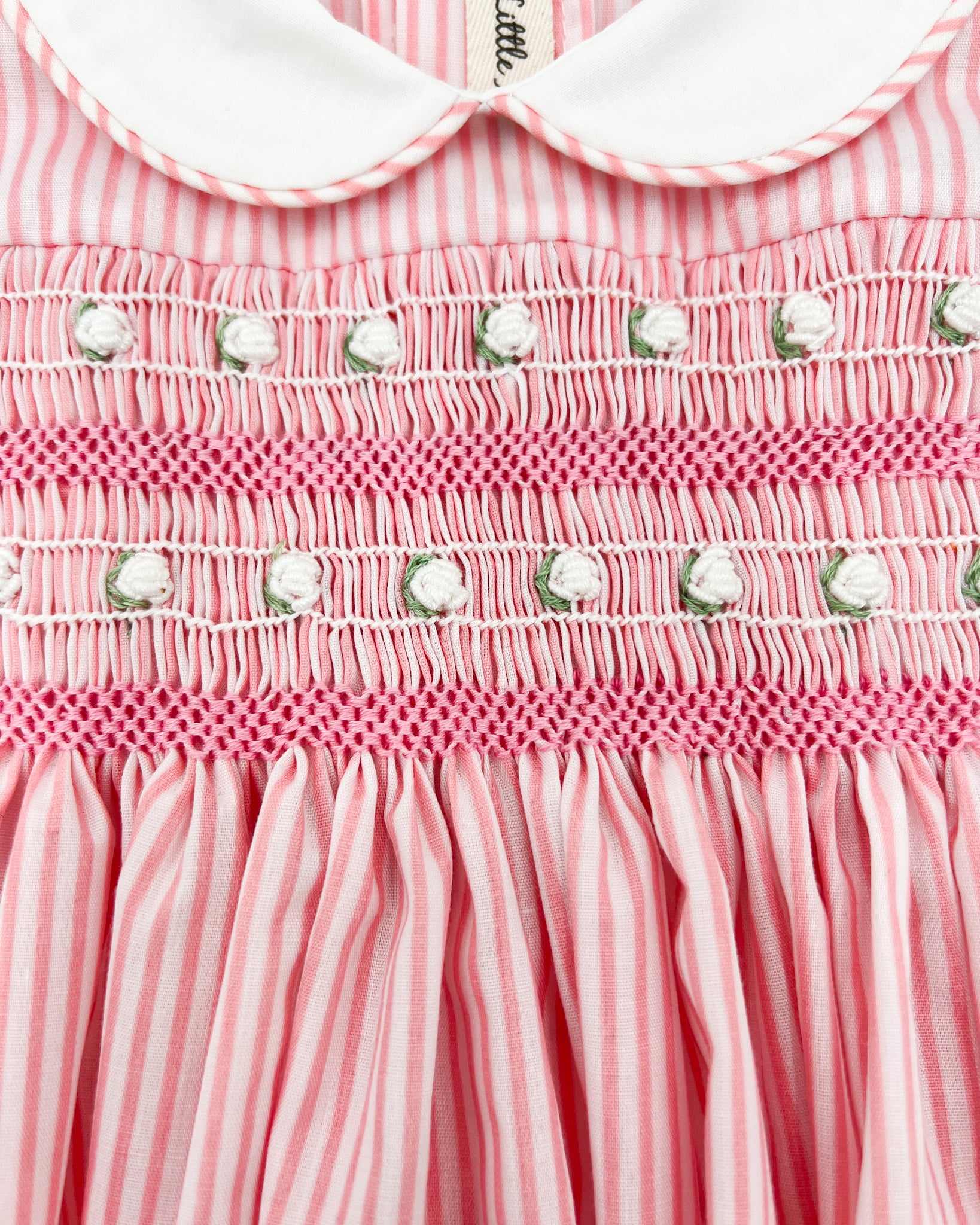 Pink smocked dress with a floral hand embroidered bodice design and peter-pan style collar made with high quality polycotton.