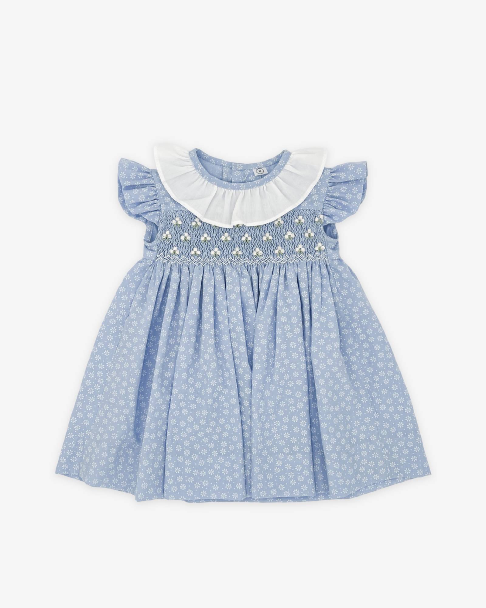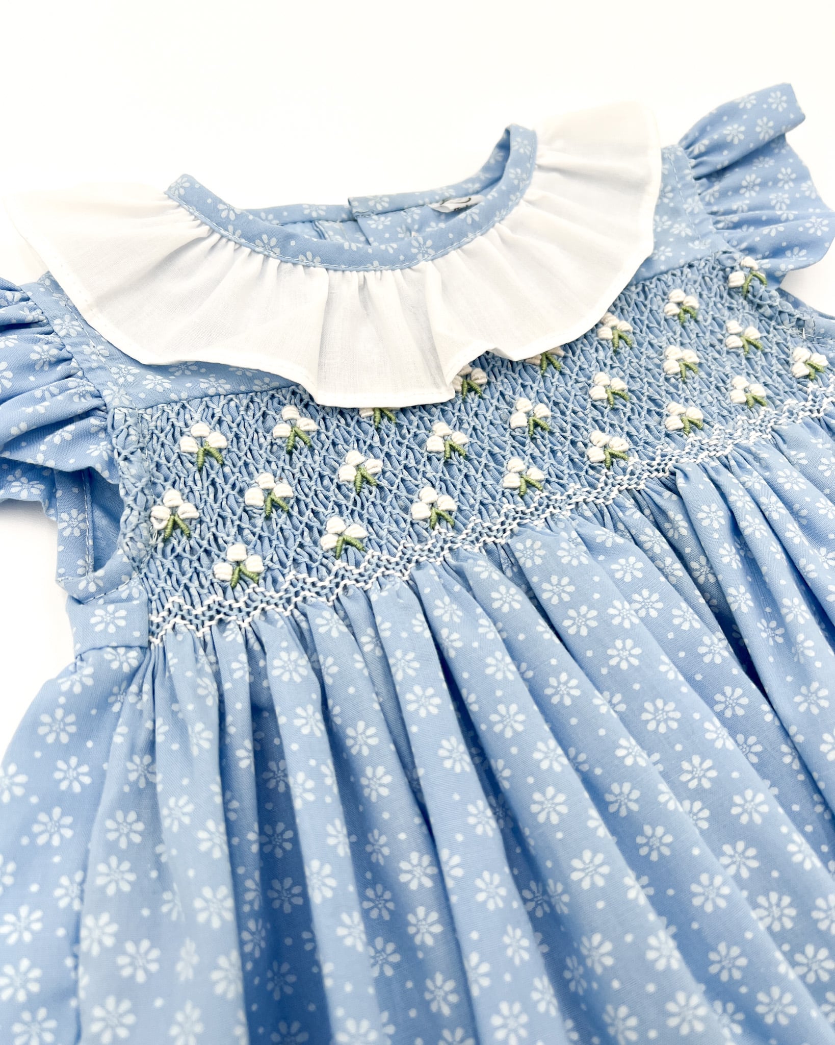 Light blue smocked dress with a floral hand embroidered bodice design and white ruffle collar collar made of high quality polycotton.