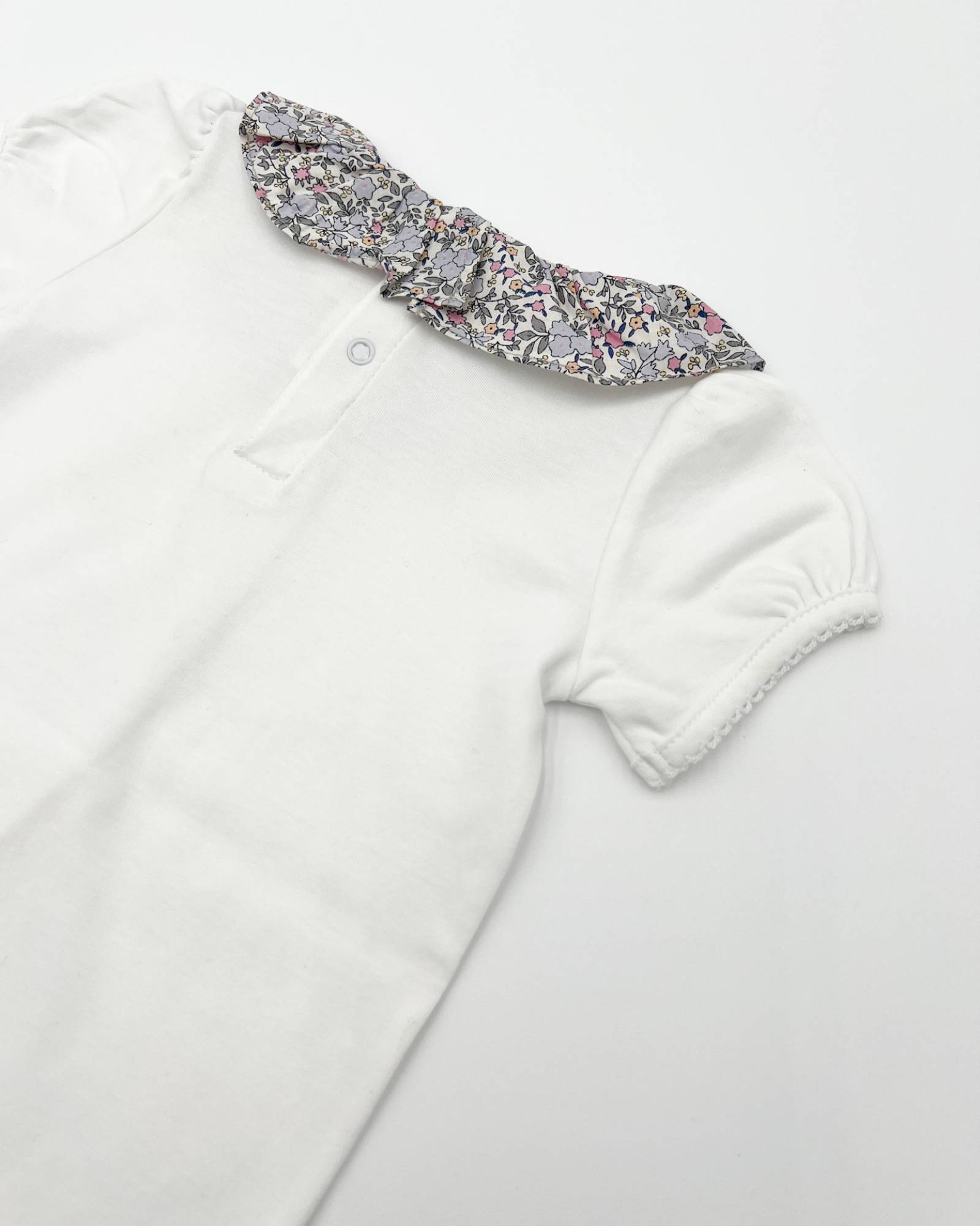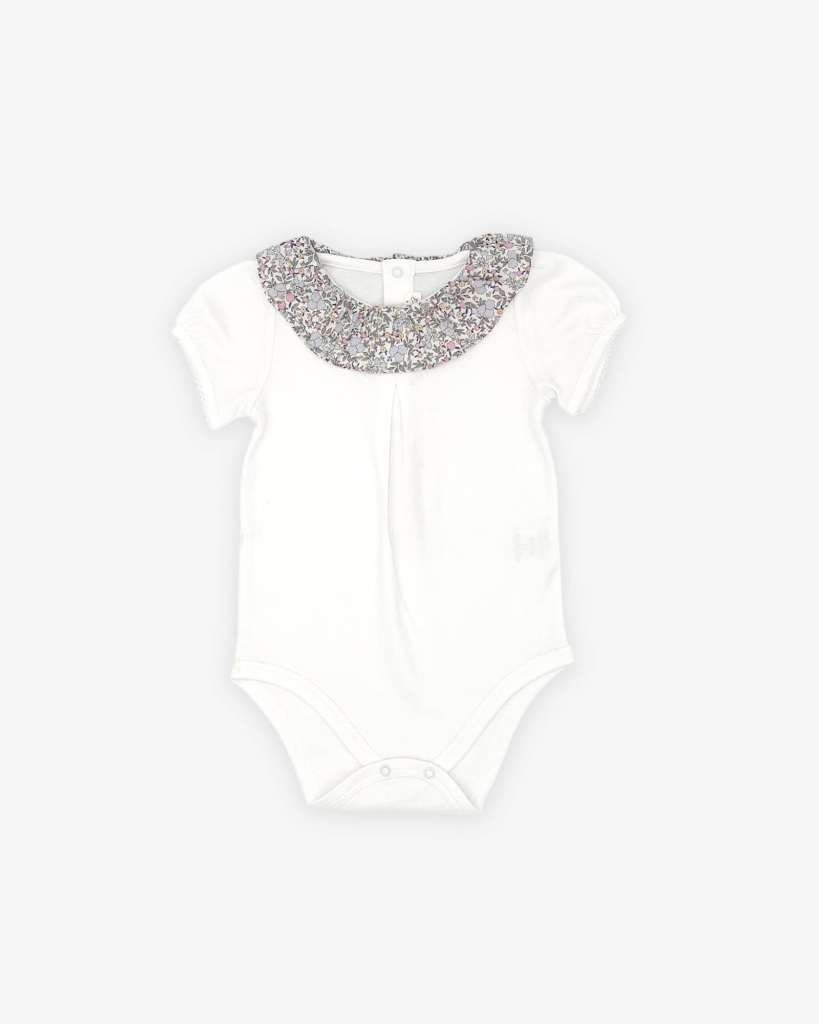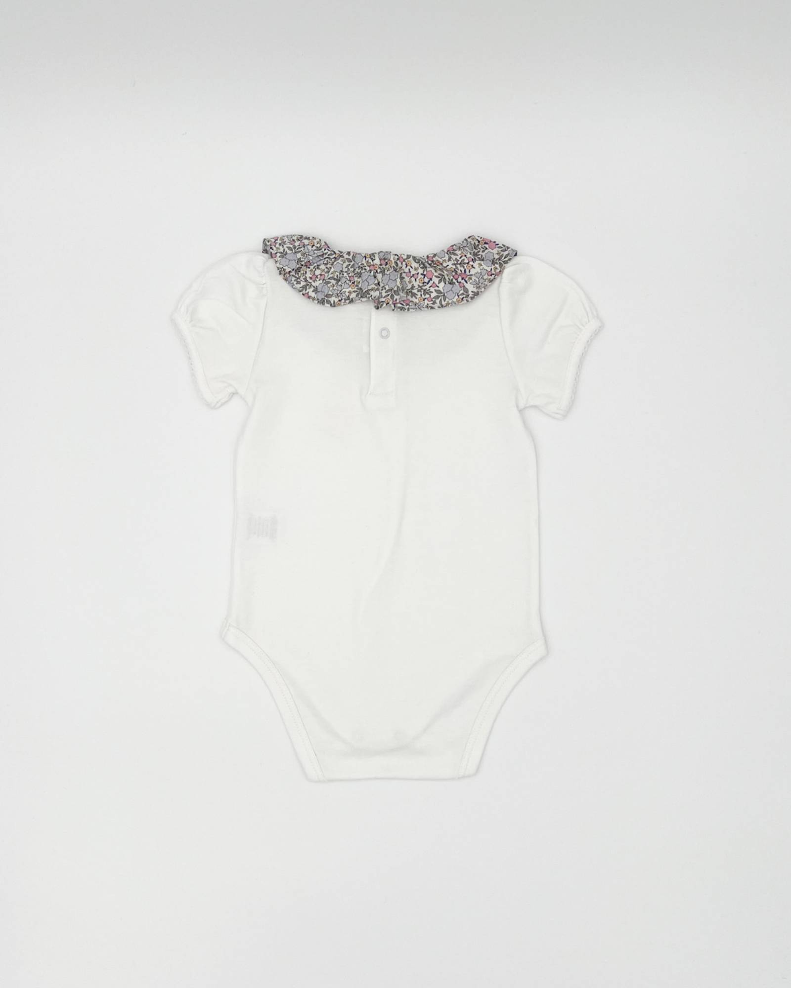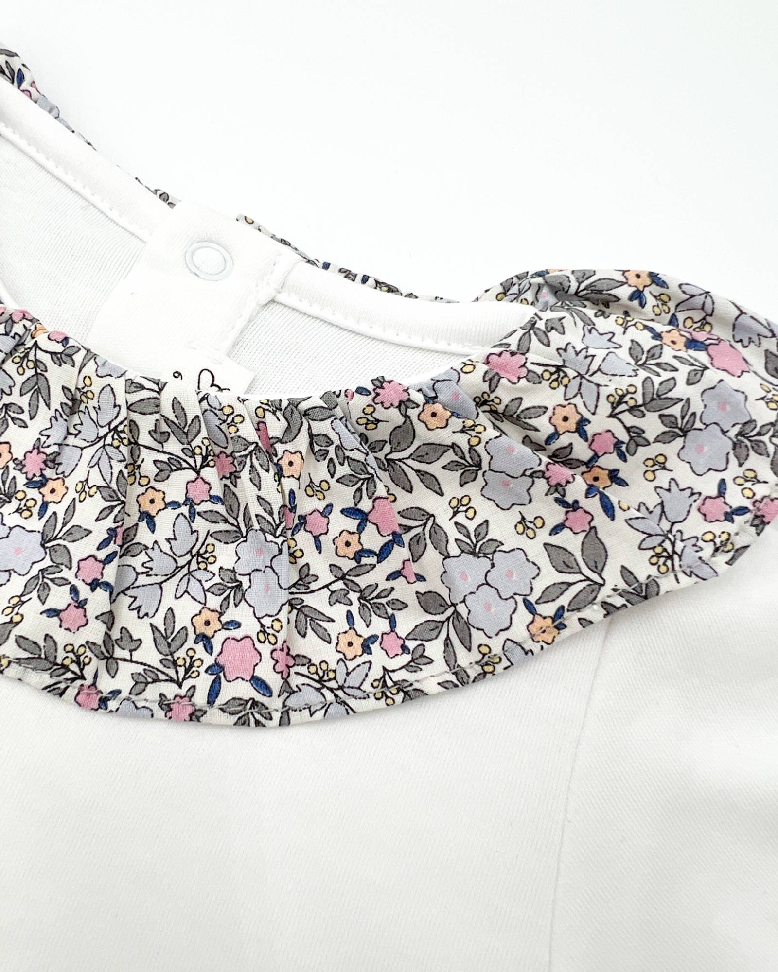 The Amelia Short Sleeve Bodysuit features a lovely collar with light pink, yellow, and gray flowers, as well as embroidered sleeves. It is crafted from 100% Pima cotton in Peru and is available in sizes 0-18 months.