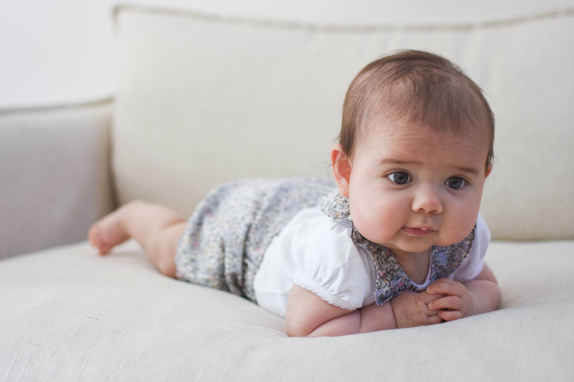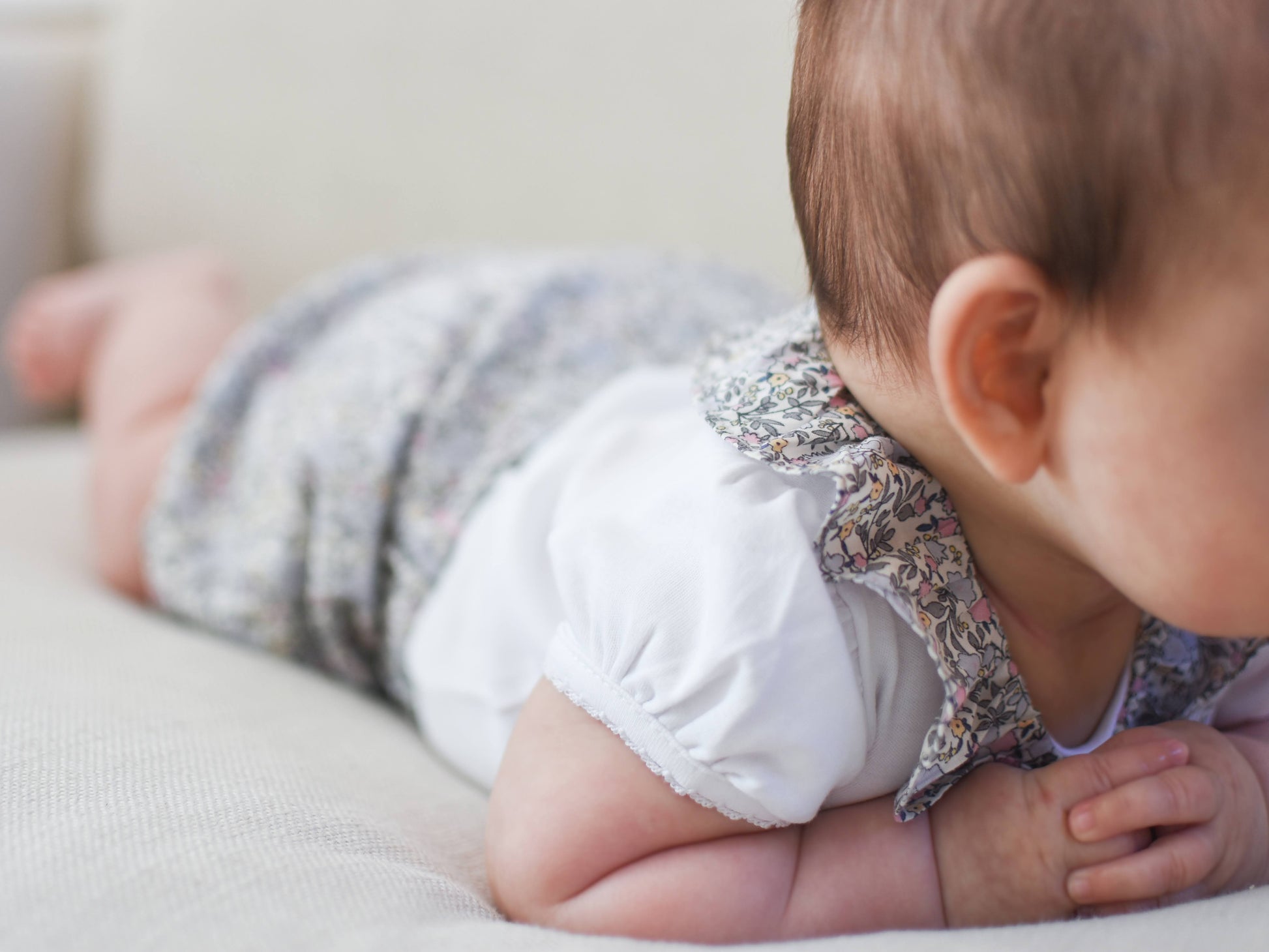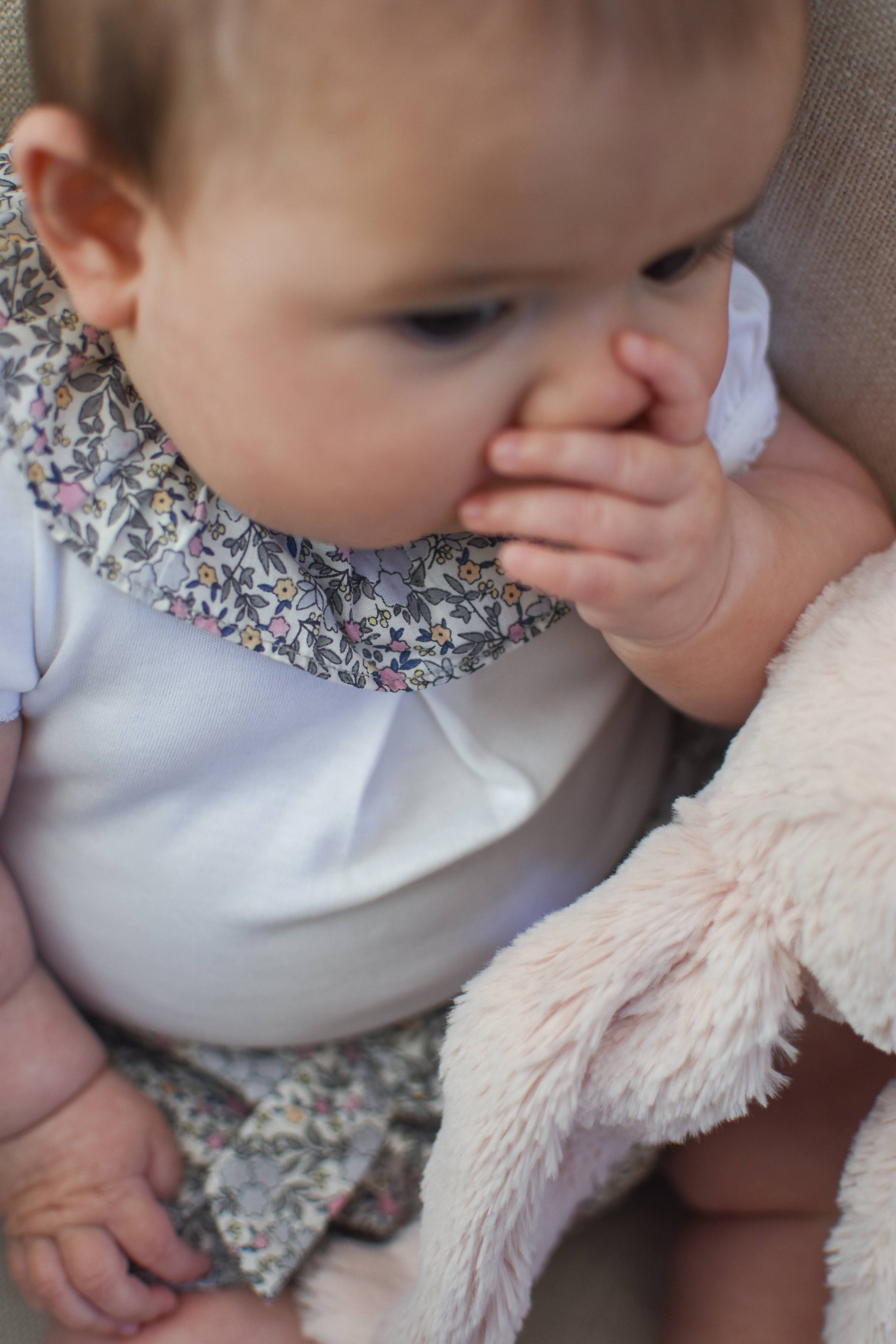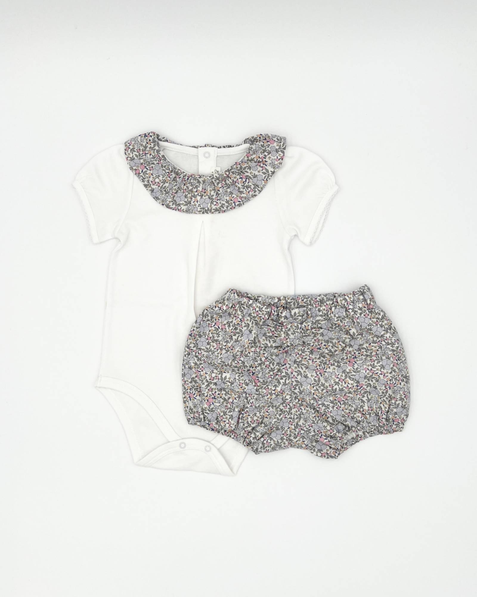 The Amelia Short Sleeve Bodysuit features a lovely collar with light pink, yellow, and gray flowers, as well as embroidered sleeves. It is crafted from 100% Pima cotton in Peru and is available in sizes 0-18 months.