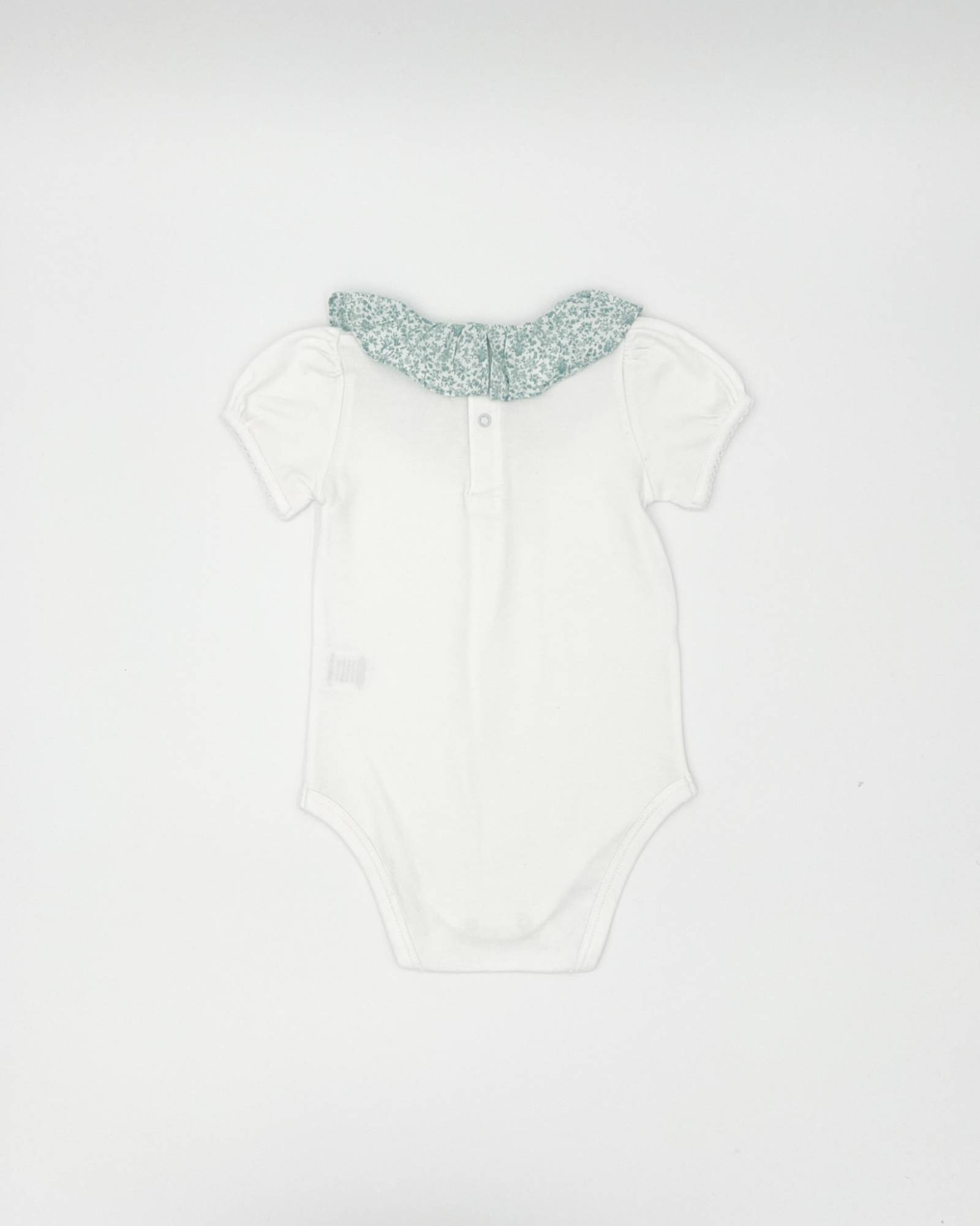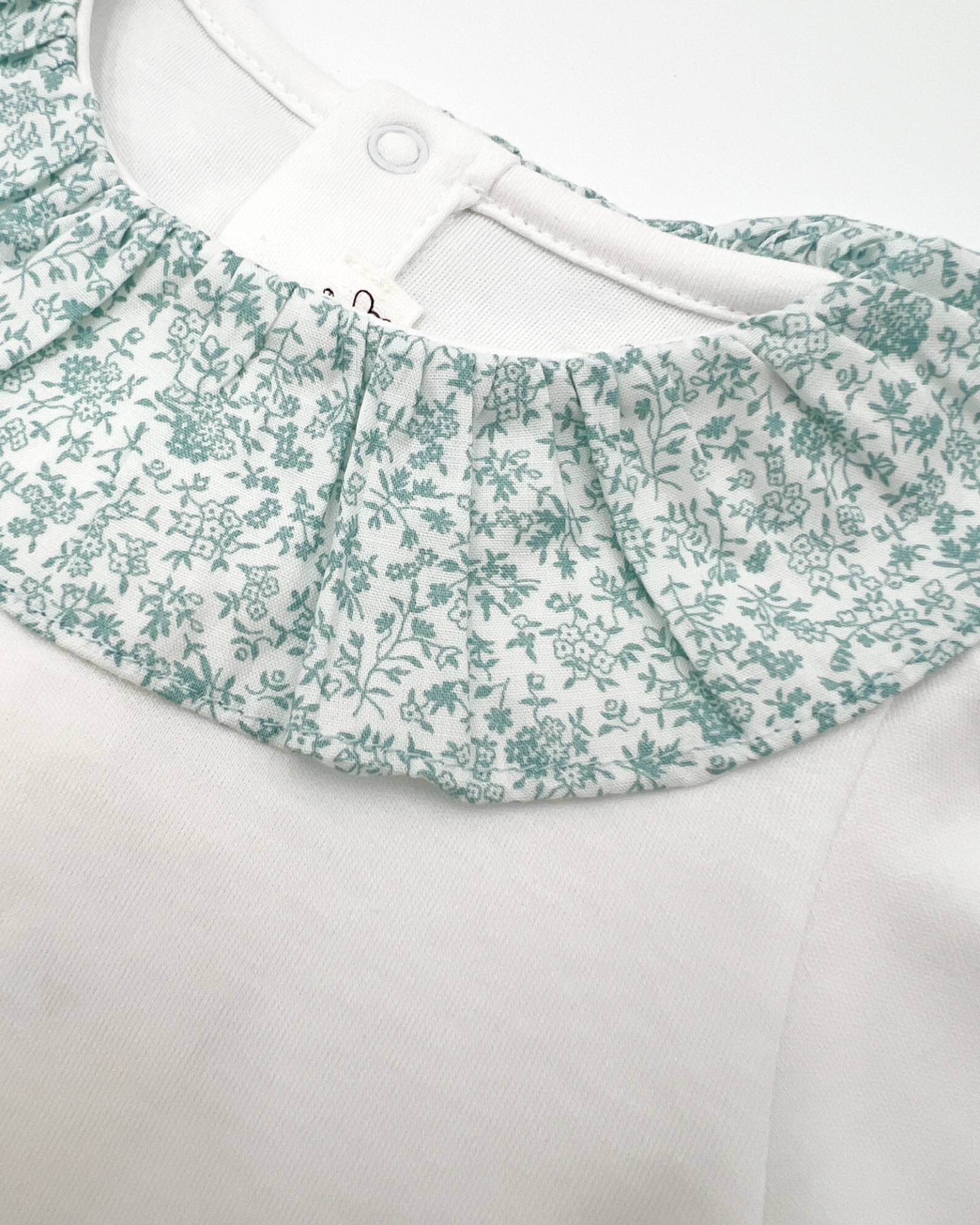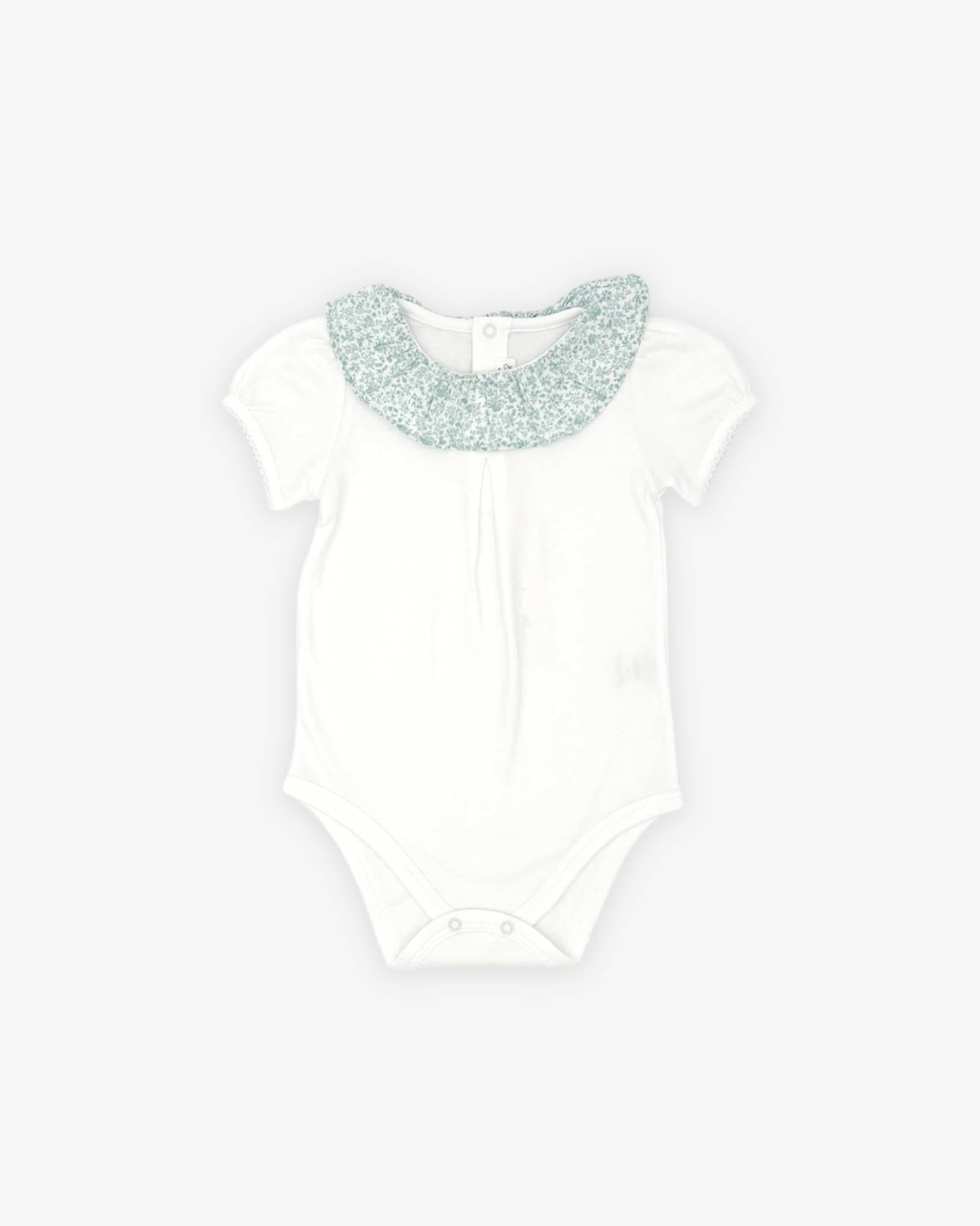 The Catalina Short Sleeve Bodysuit features a lovely green floral collar and embroidered sleeves. It is crafted from 100% Pima cotton in Peru and is available in sizes 0-18 months.
