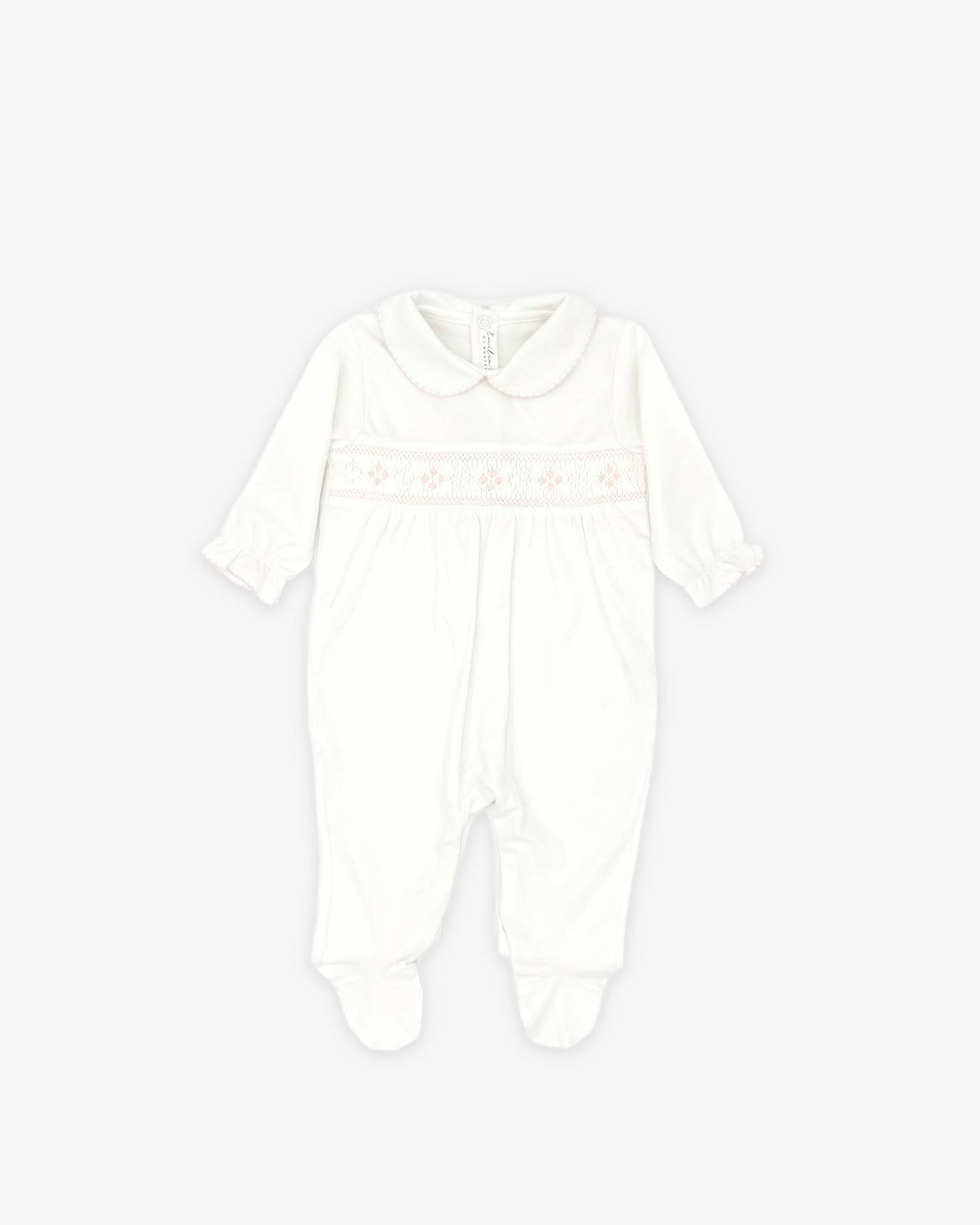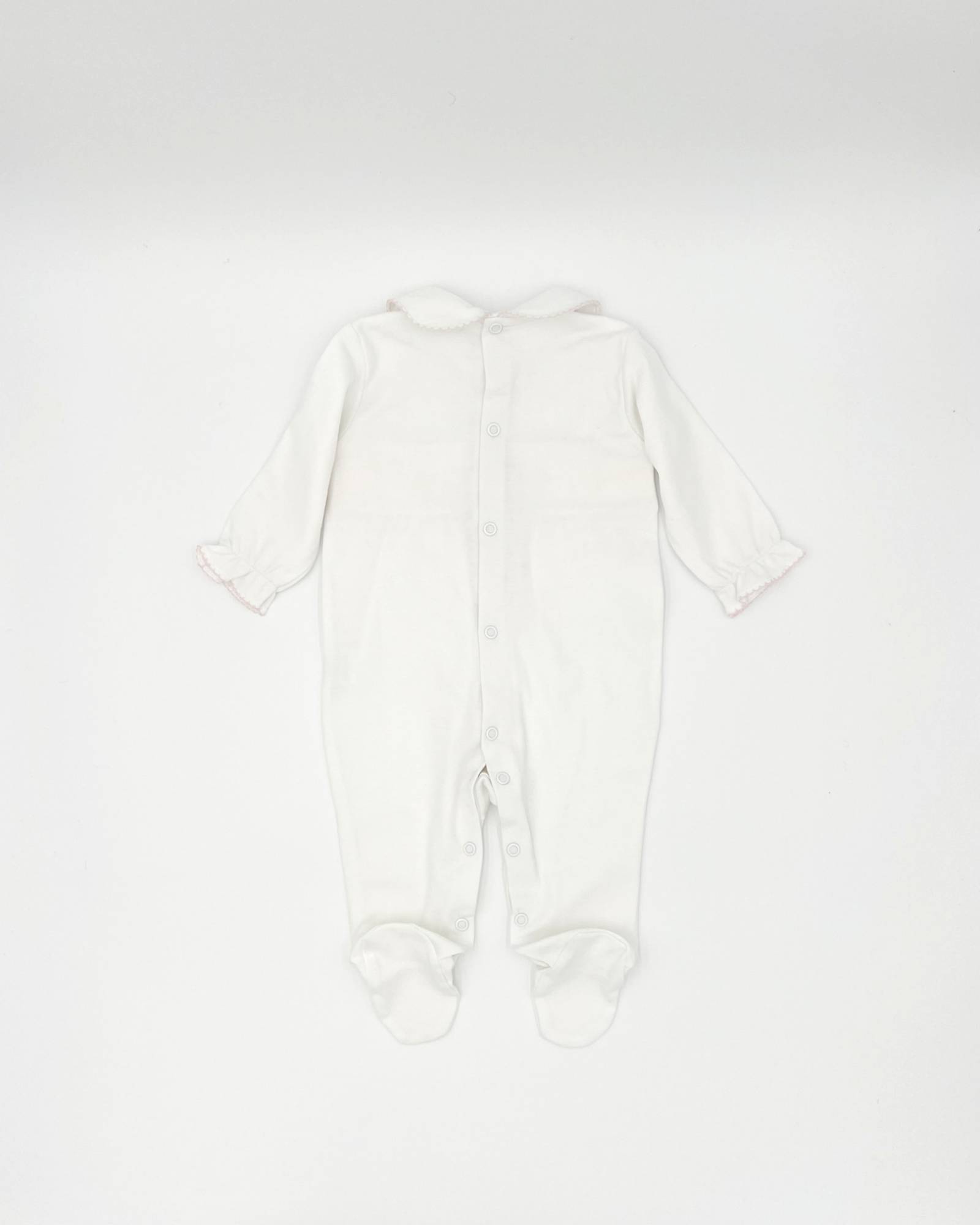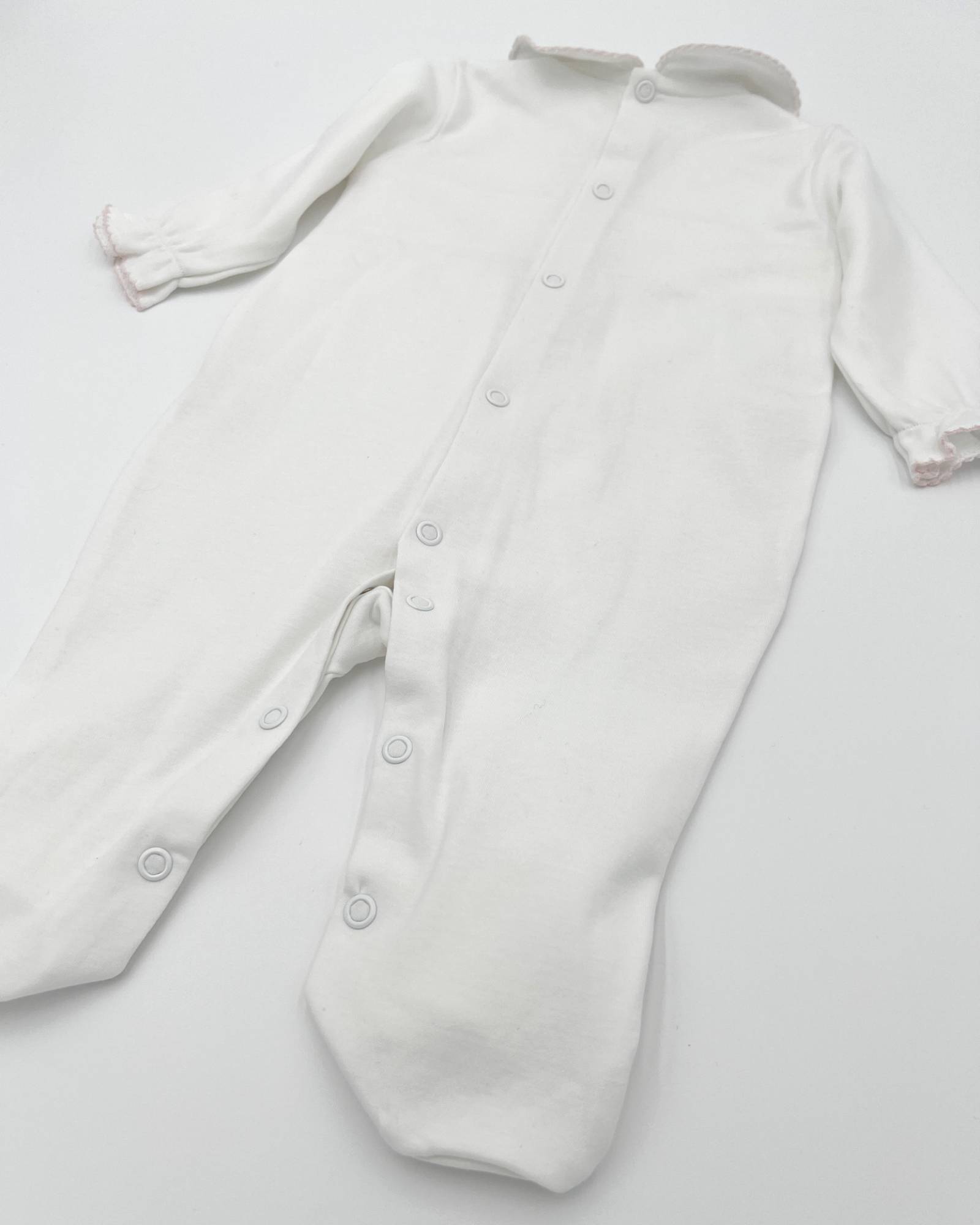 Crafted from 100% Pima cotton in Peru, this white baby pajama features a delicate, hand-embroidered pink pattern. Available from 0 - 6 months.
