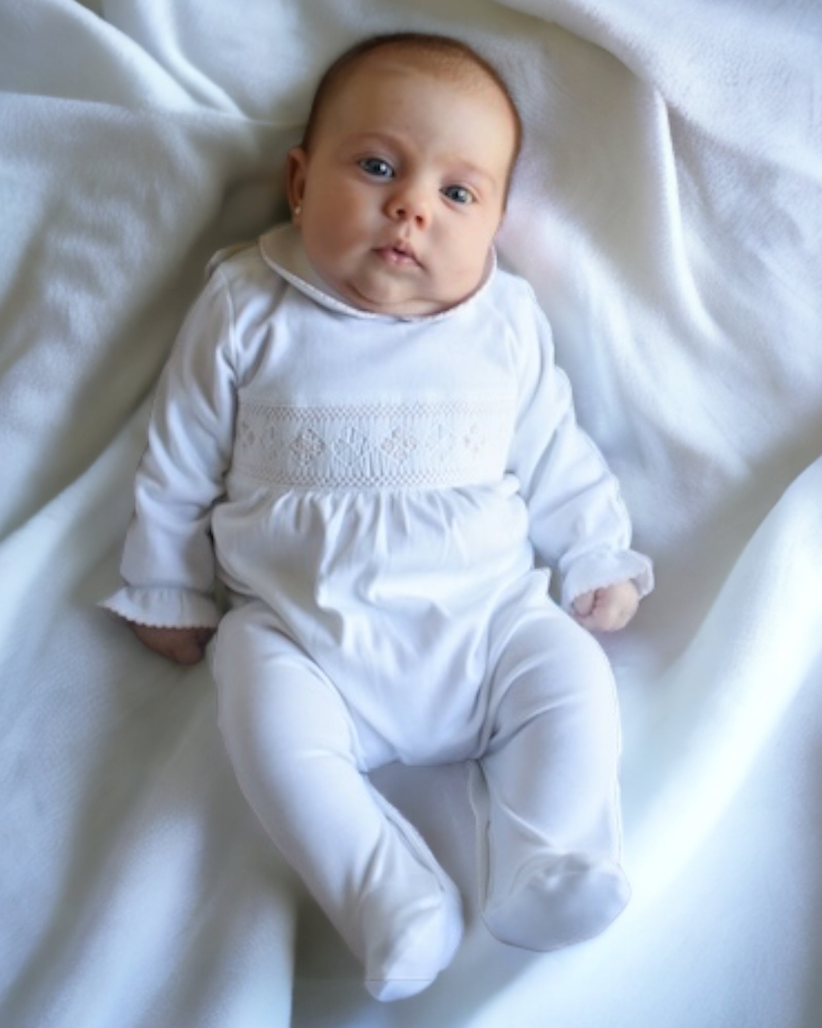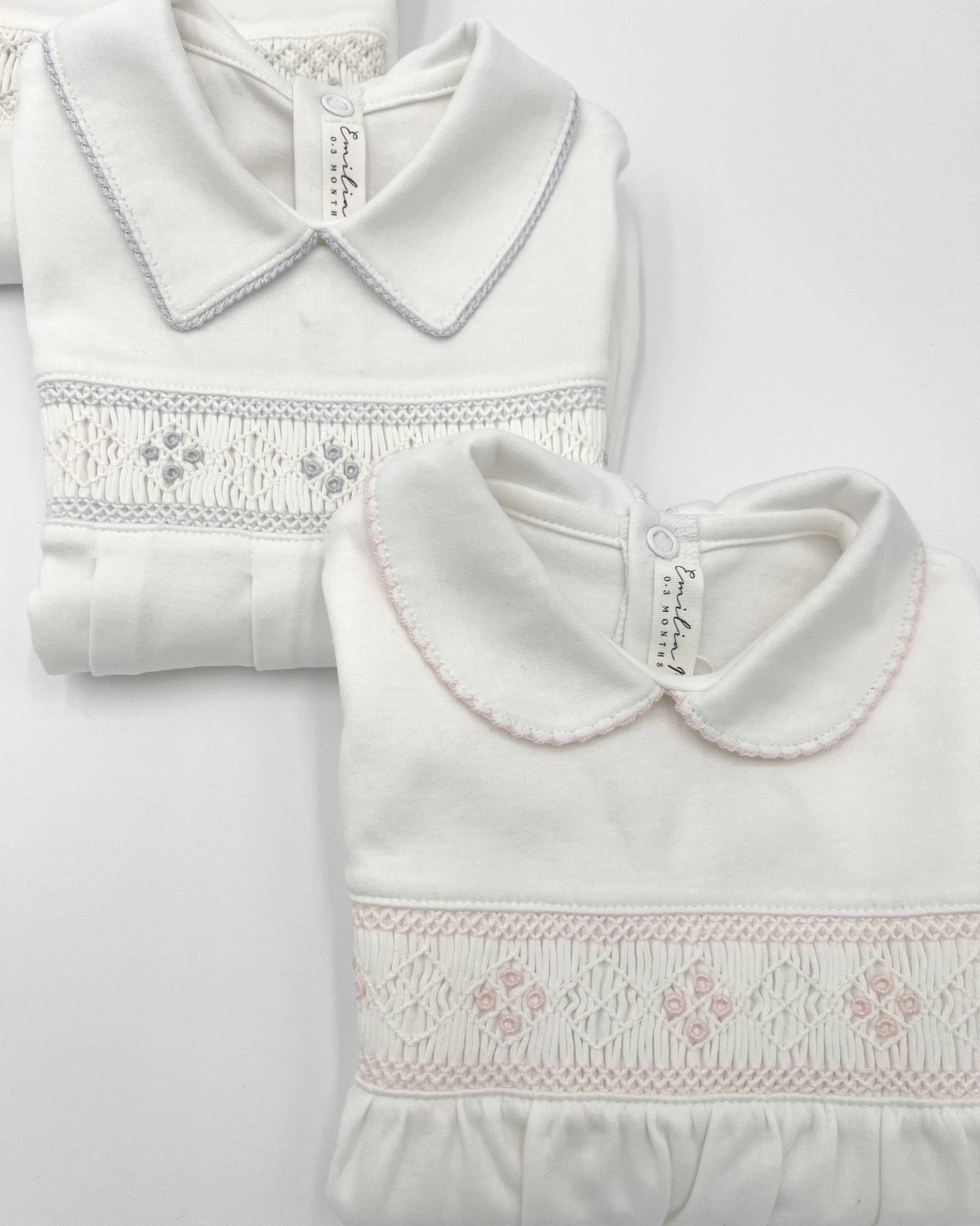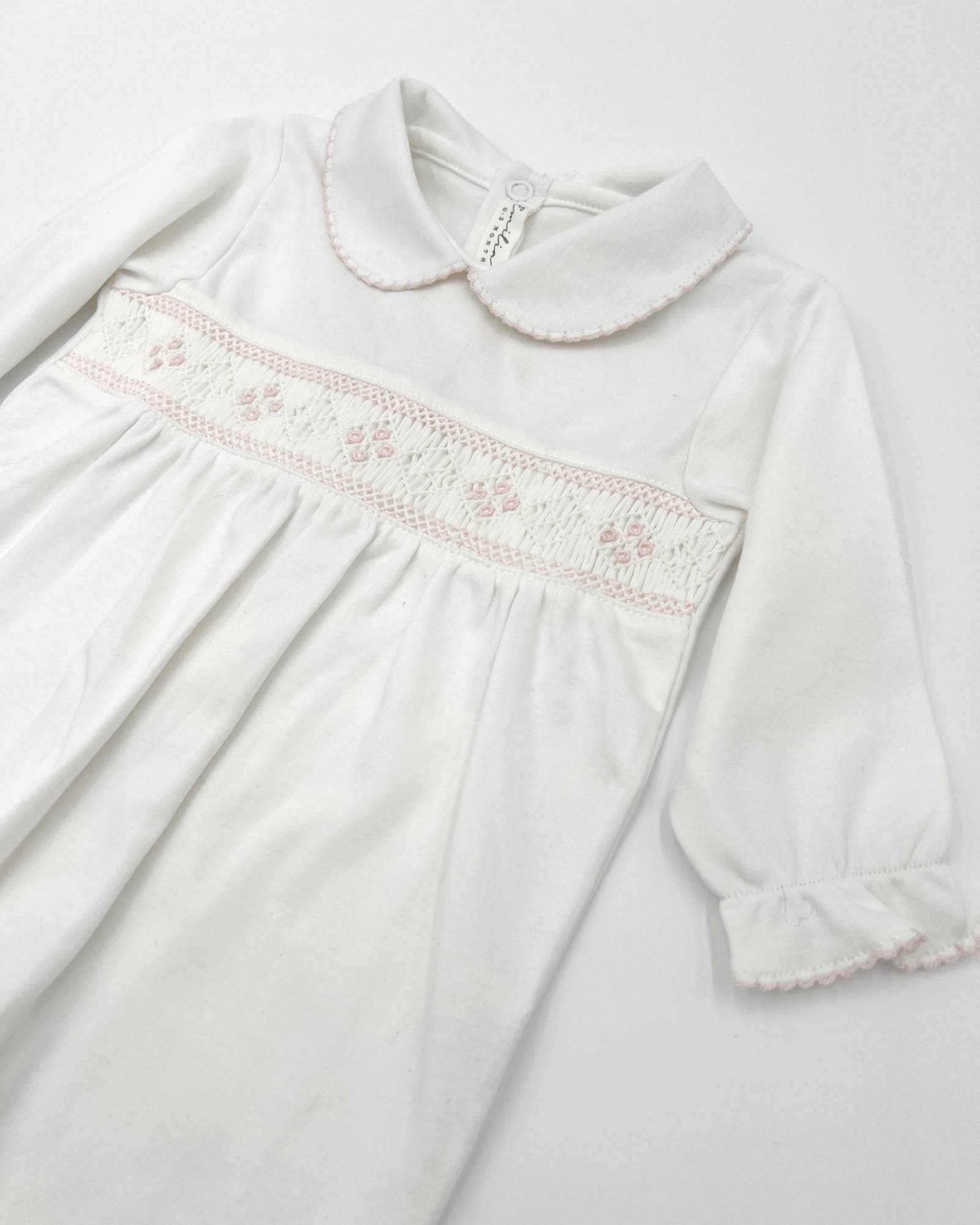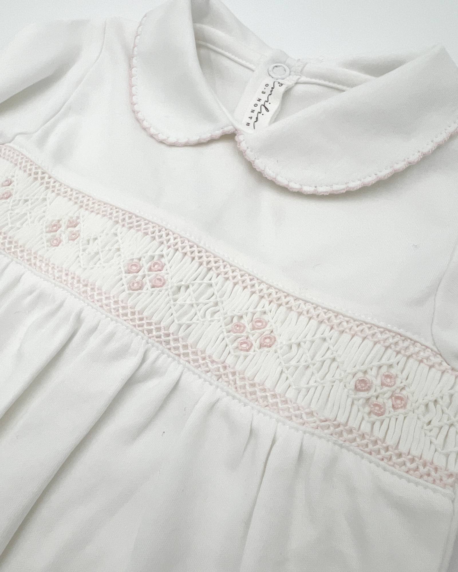 Crafted from 100% Pima cotton in Peru, this white baby pajama features a delicate, hand-embroidered pink pattern. Available from 0 - 6 months.