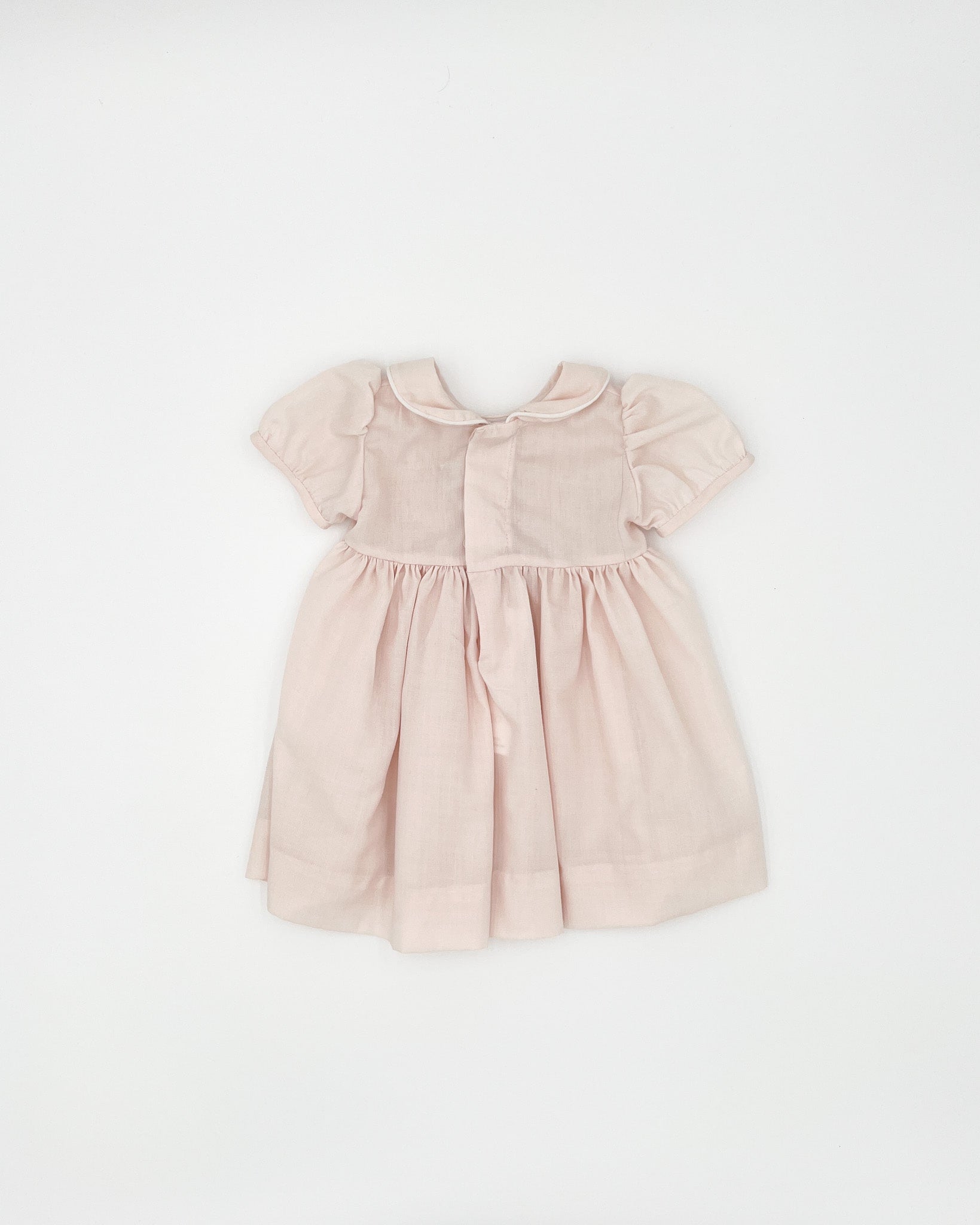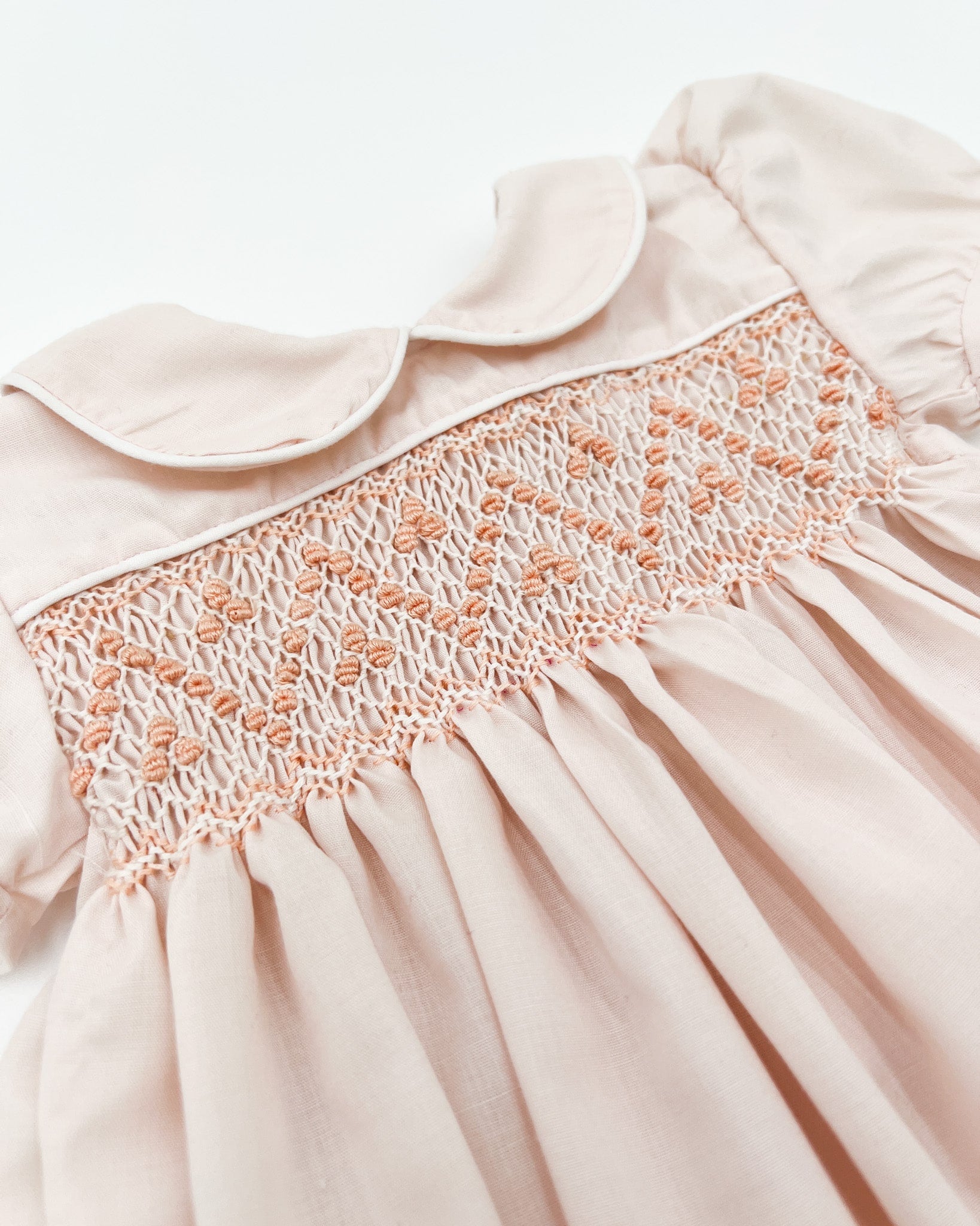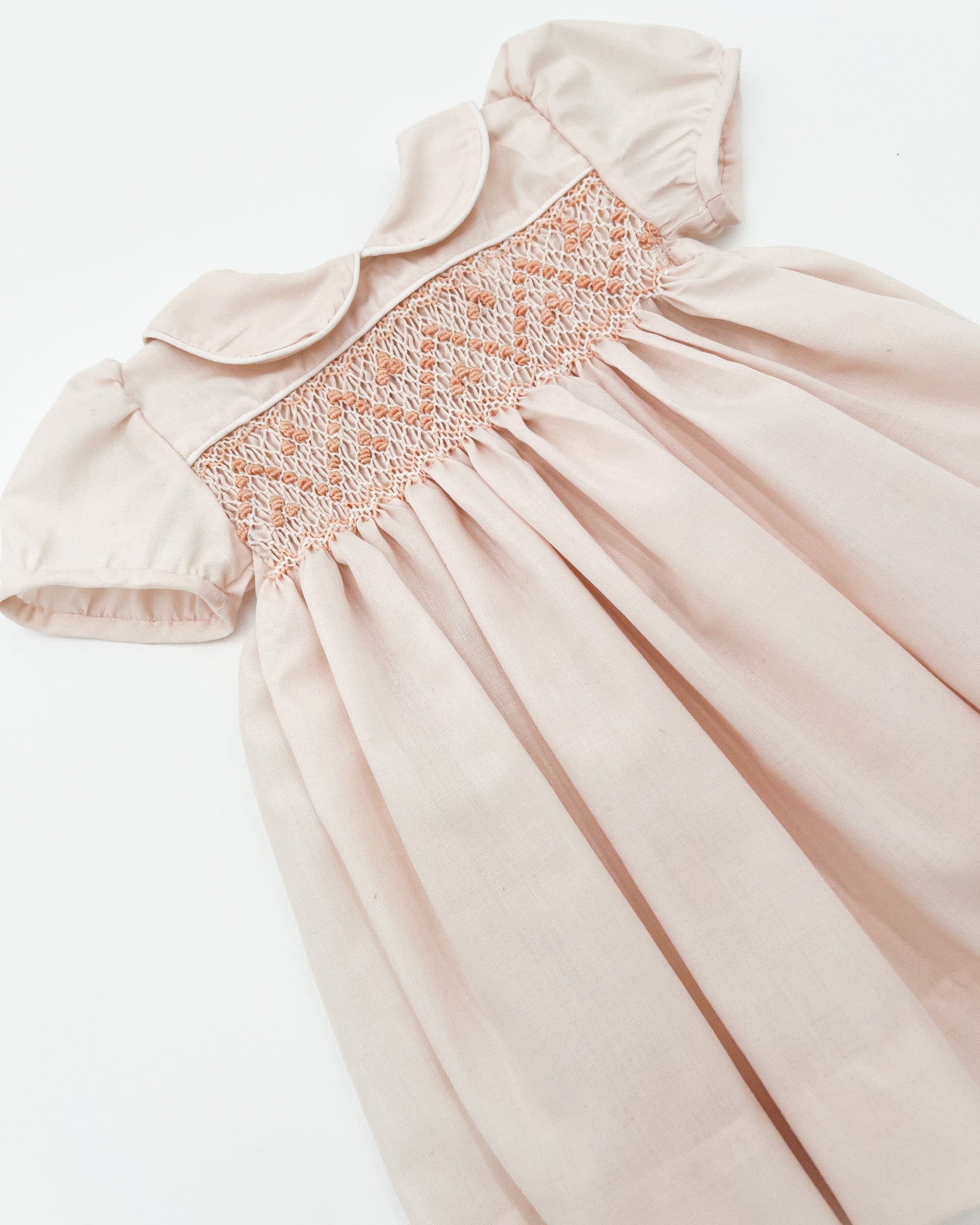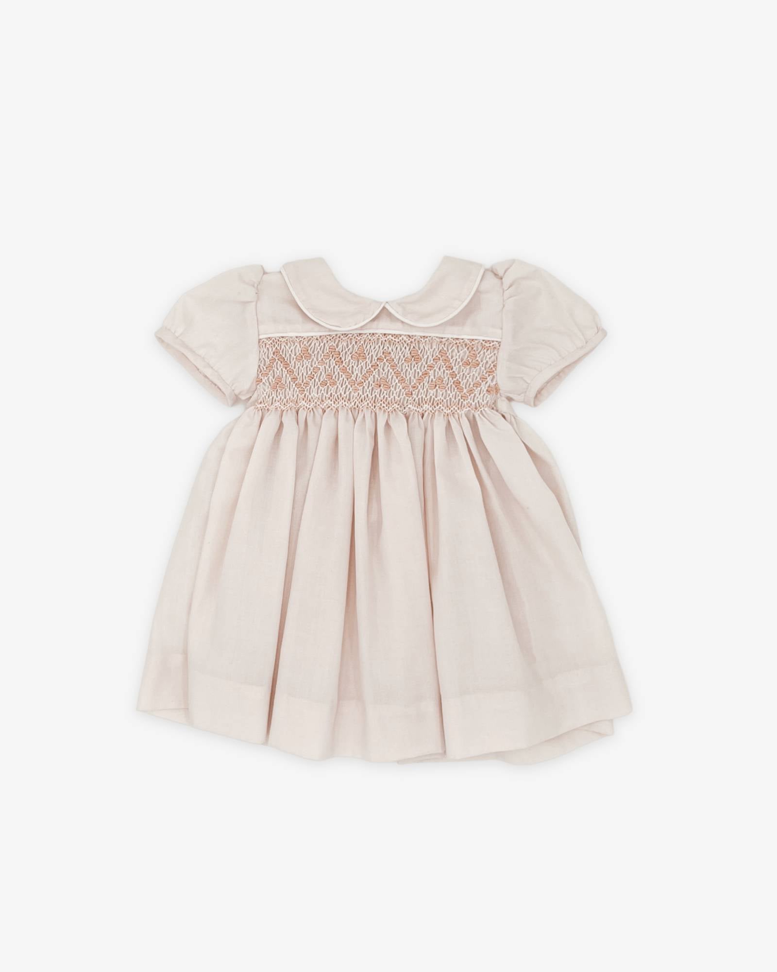Light pink-peach smocked dress featuring a hand embroidered bodice and peter-pan style collar made of high quality polycotton.