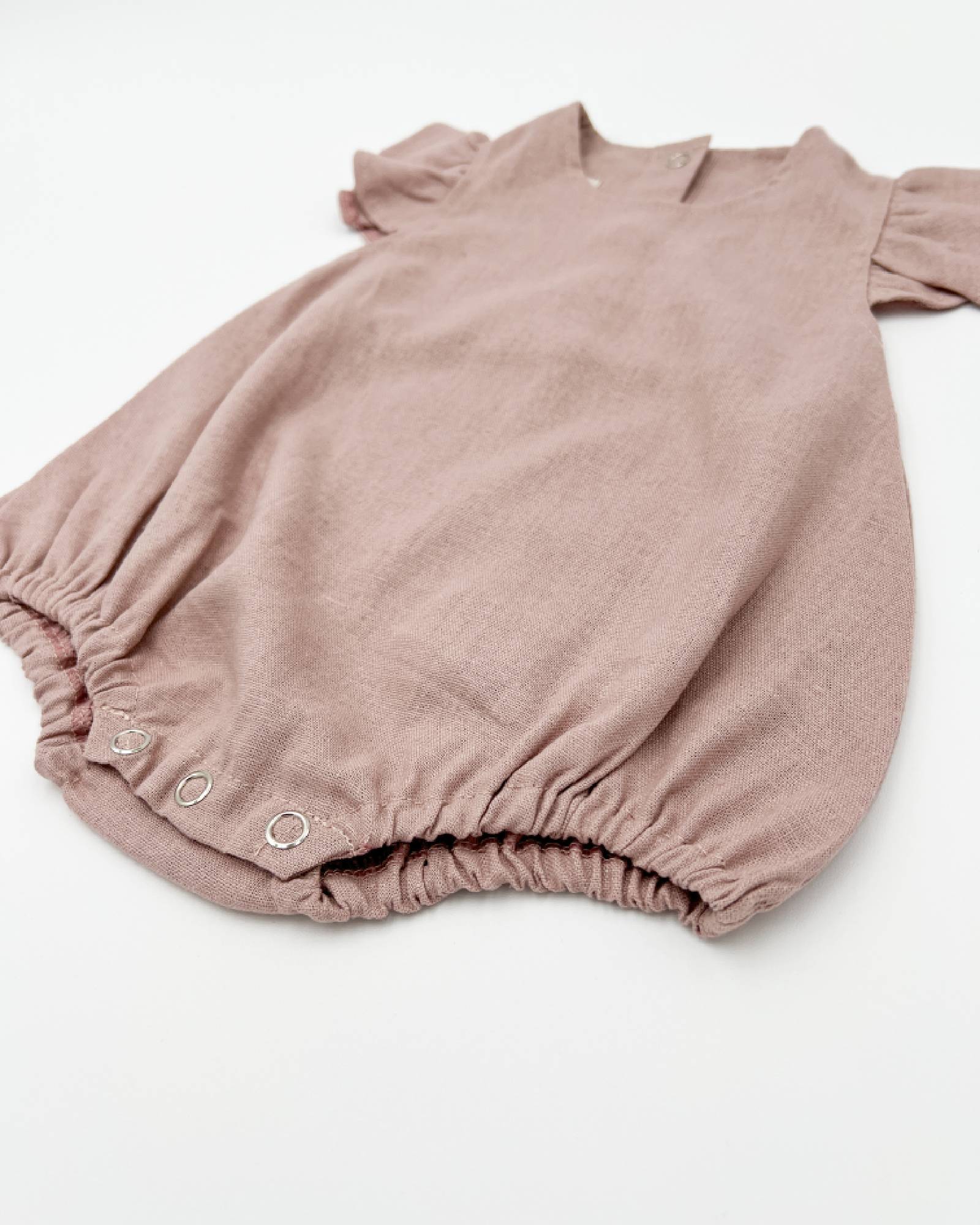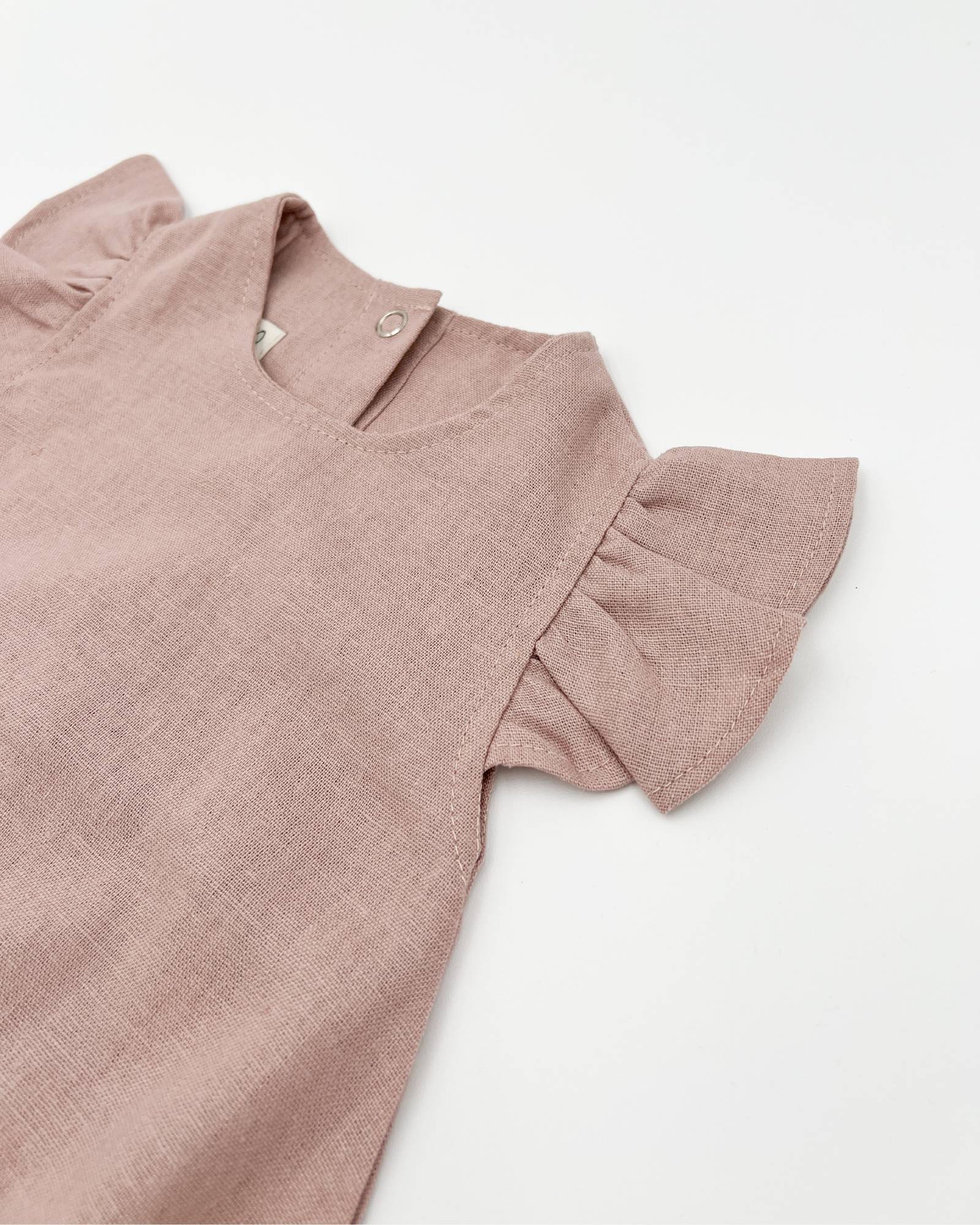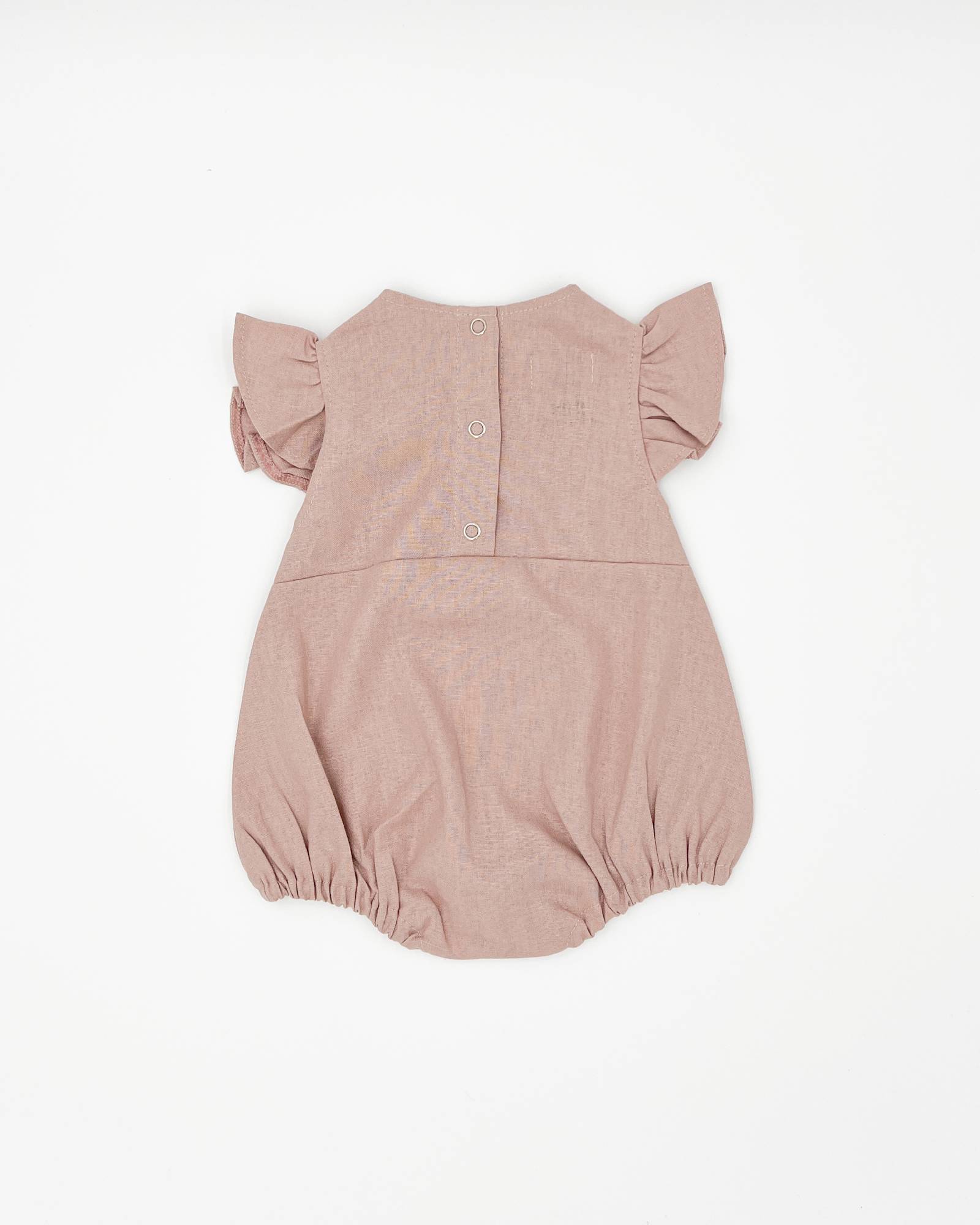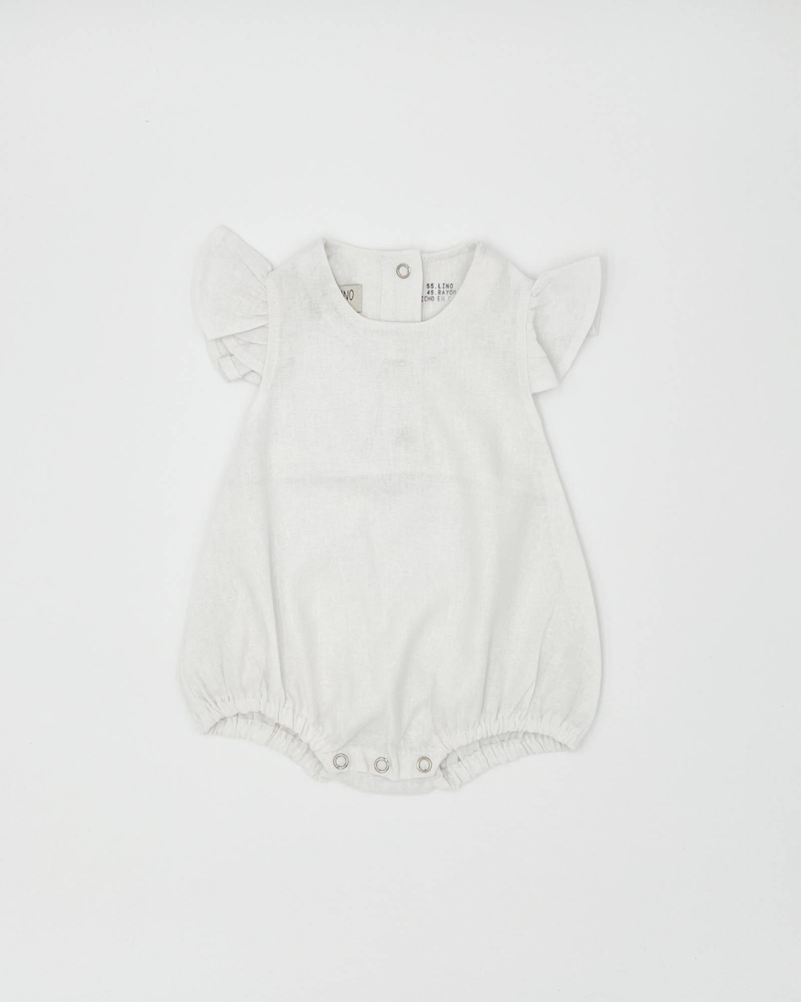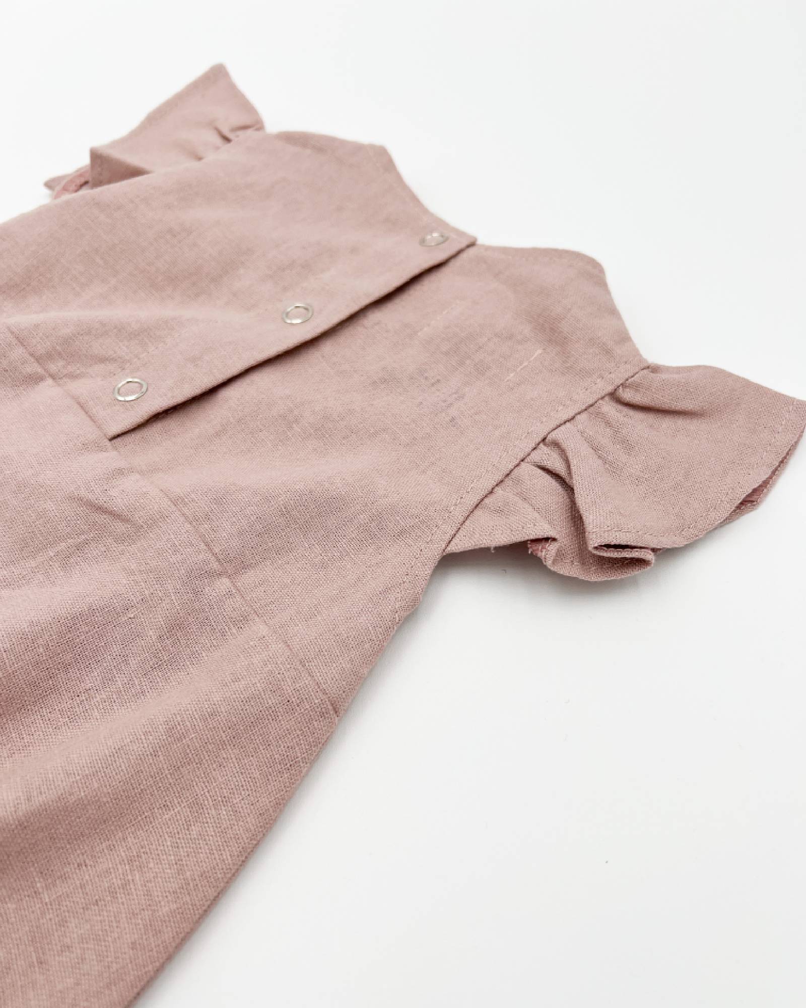 Crafted with durable linen, this romper features sweet ruffled sleeves, elasticated leg openings, and poppers for a comfortable fit. The fabric is highly breathable and softens with each wash, making it perfect for both summer and winter paired with tights. Made from a blend of 55% linen and 45% rayon, it can be easily maintained by machine washing on a delicate cycle or tumble drying on medium heat. Made in Chile.