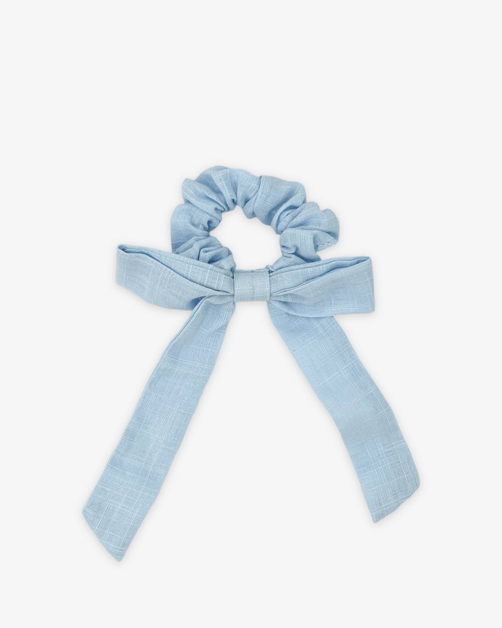 Light blue scrunchie with bow made of 100% cotton, perfect for matching with any outfit.