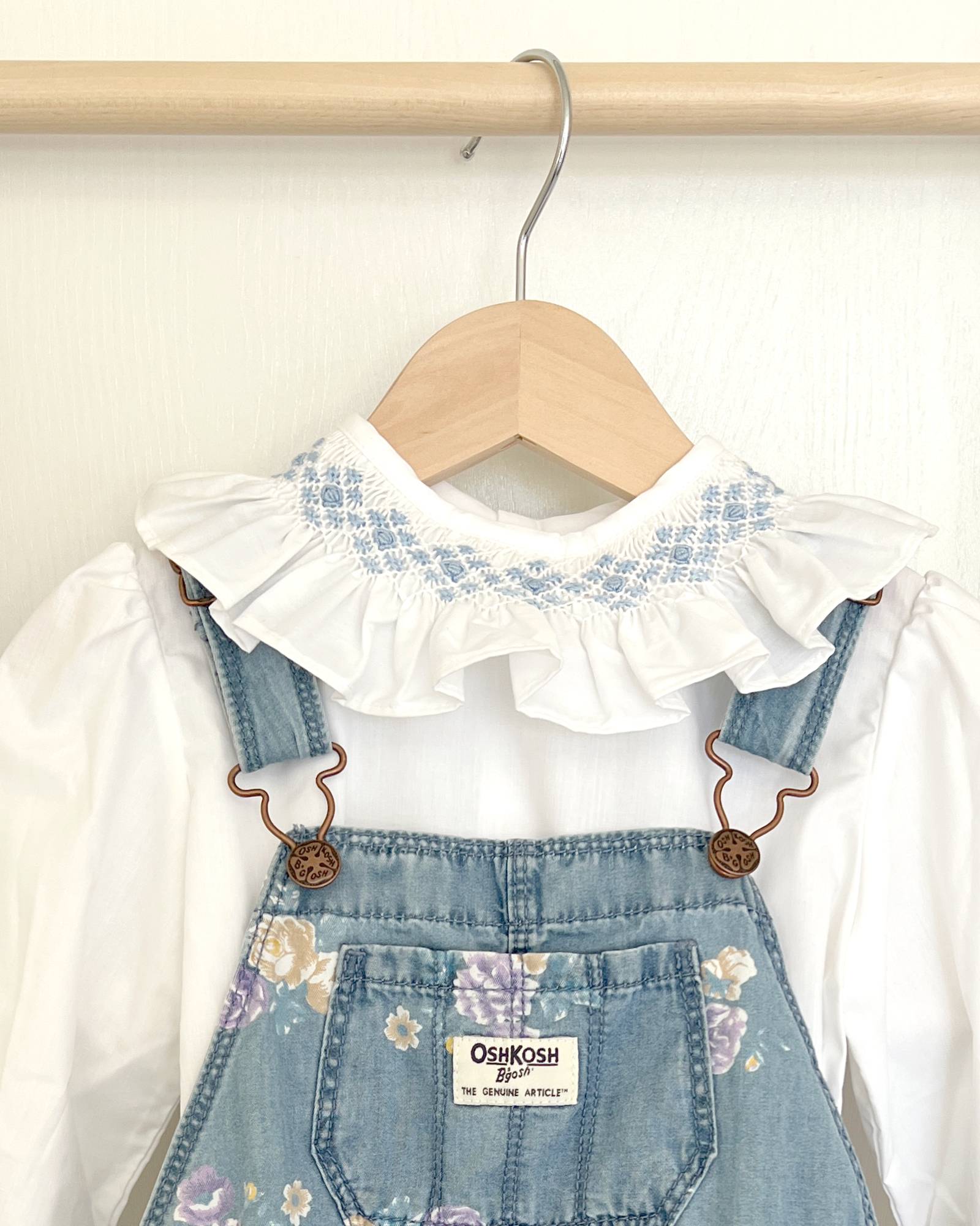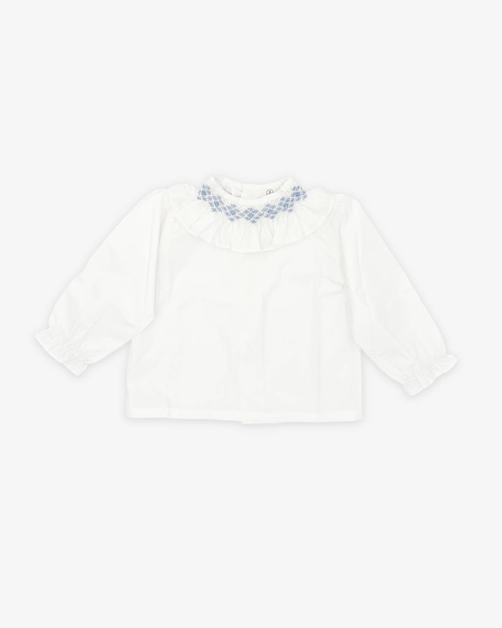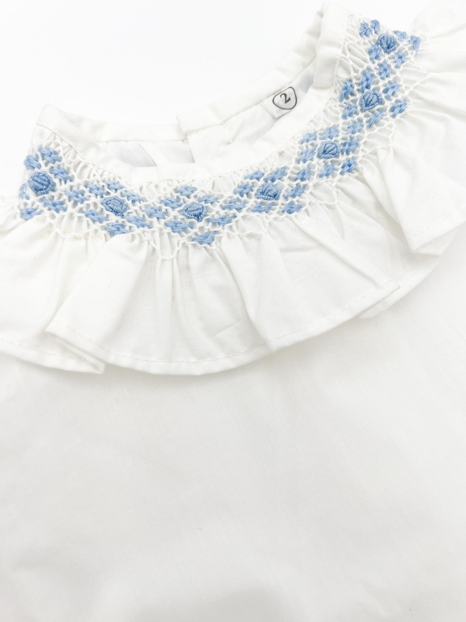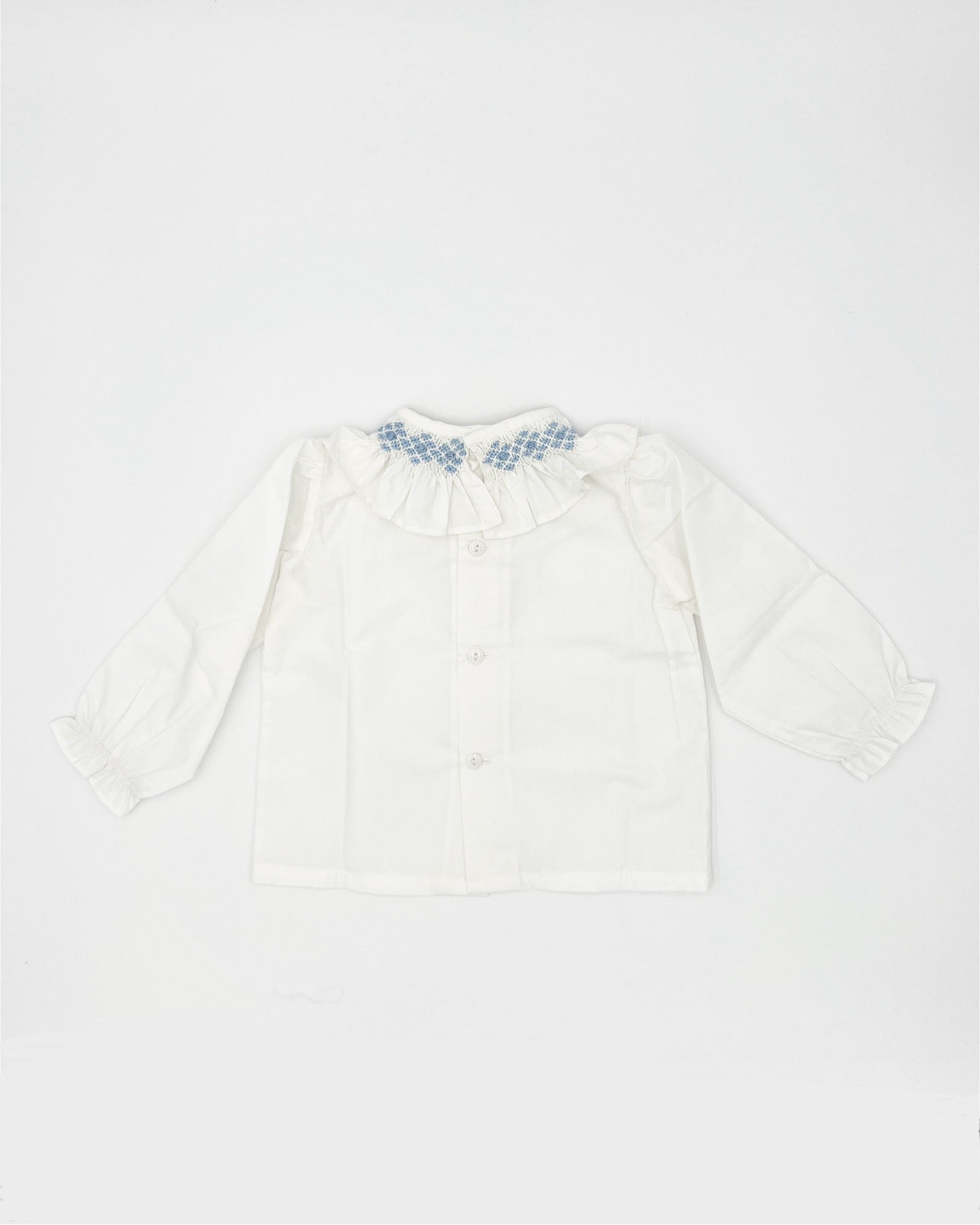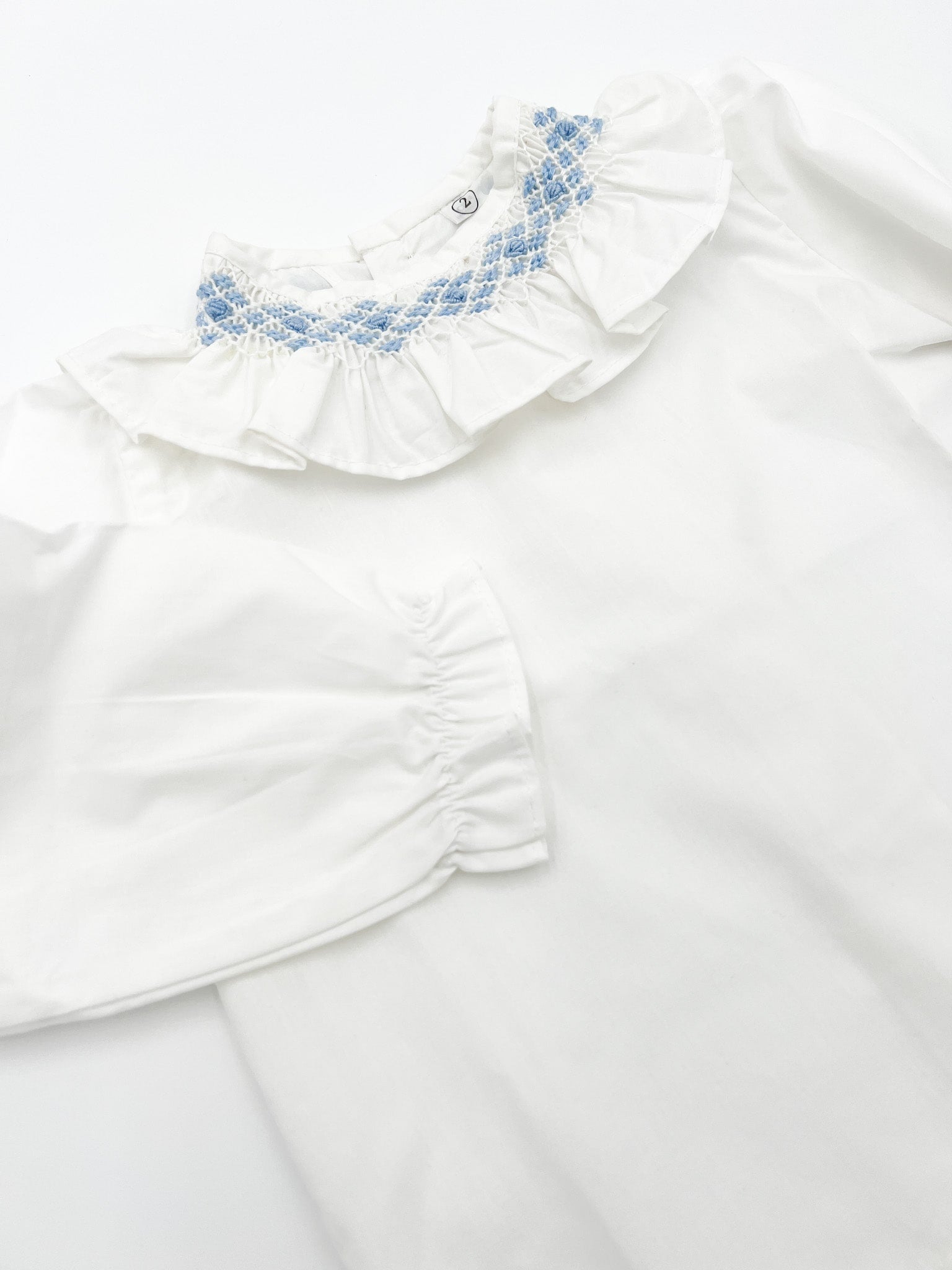 Elegant long sleeve blouse featuring a light blue hand embroidered smocked ruffled collar made with high quality polycotton.