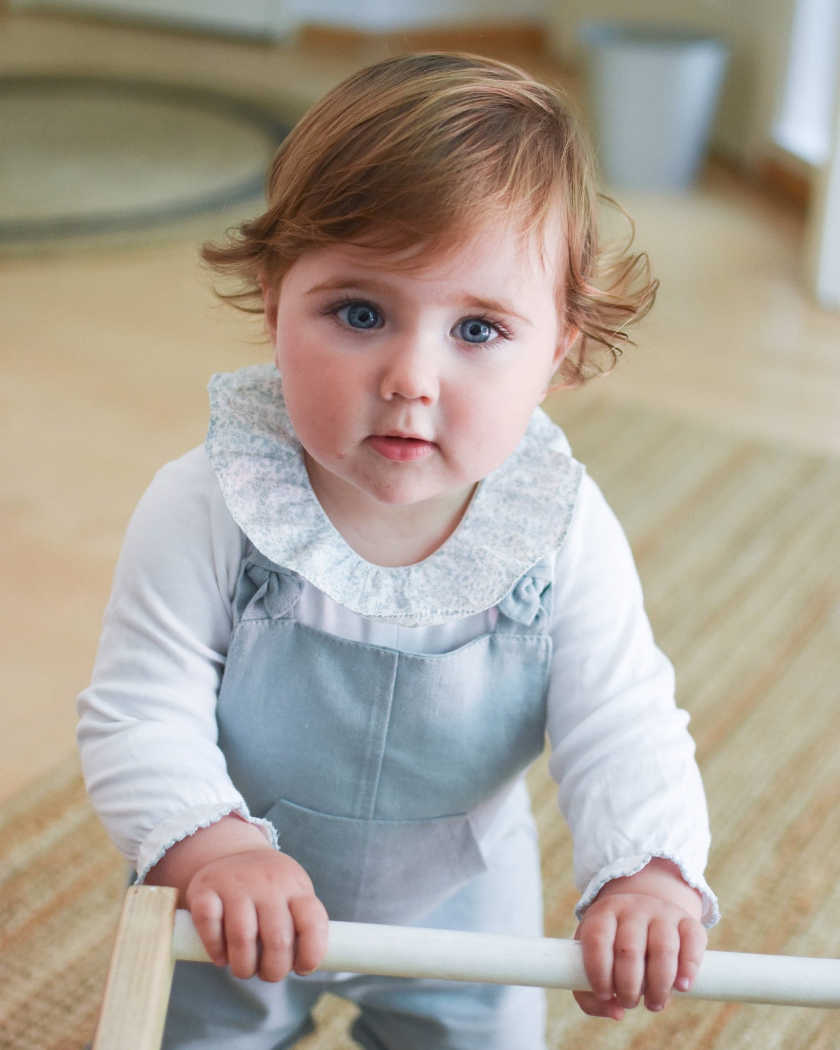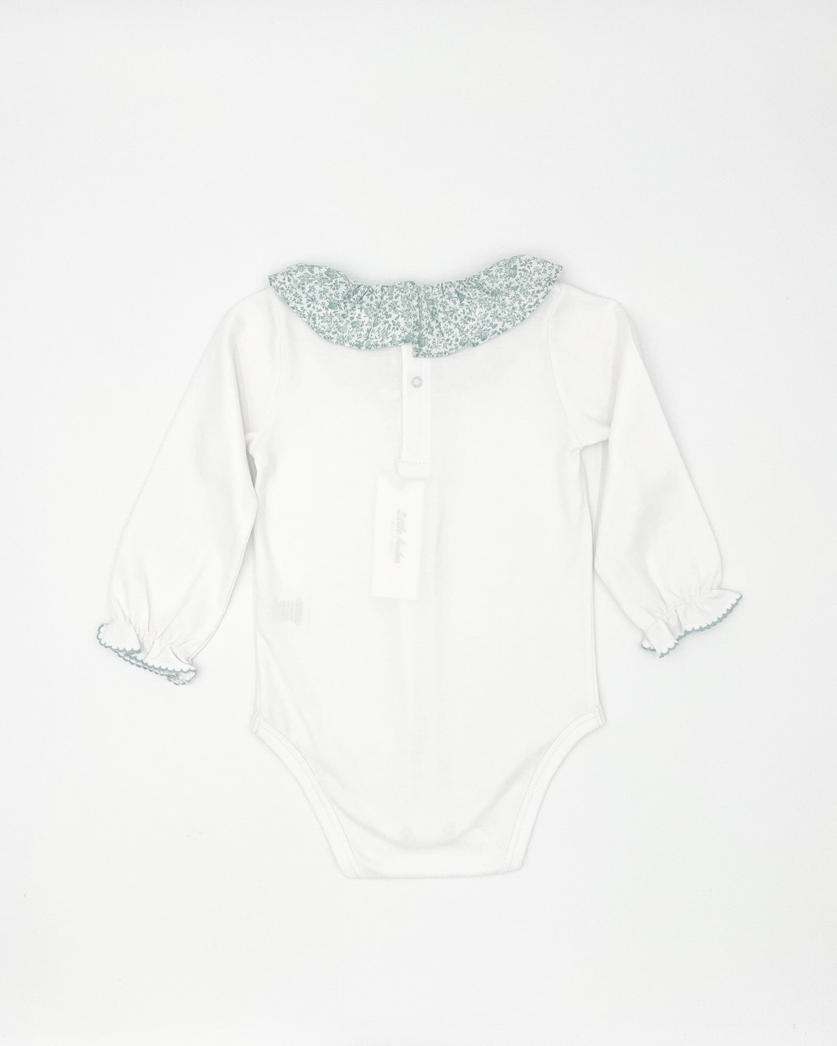 The Catalina Long Sleeve Bodysuit features a lovely green floral collar and embroidered sleeves made of 100% Pima cotton.
