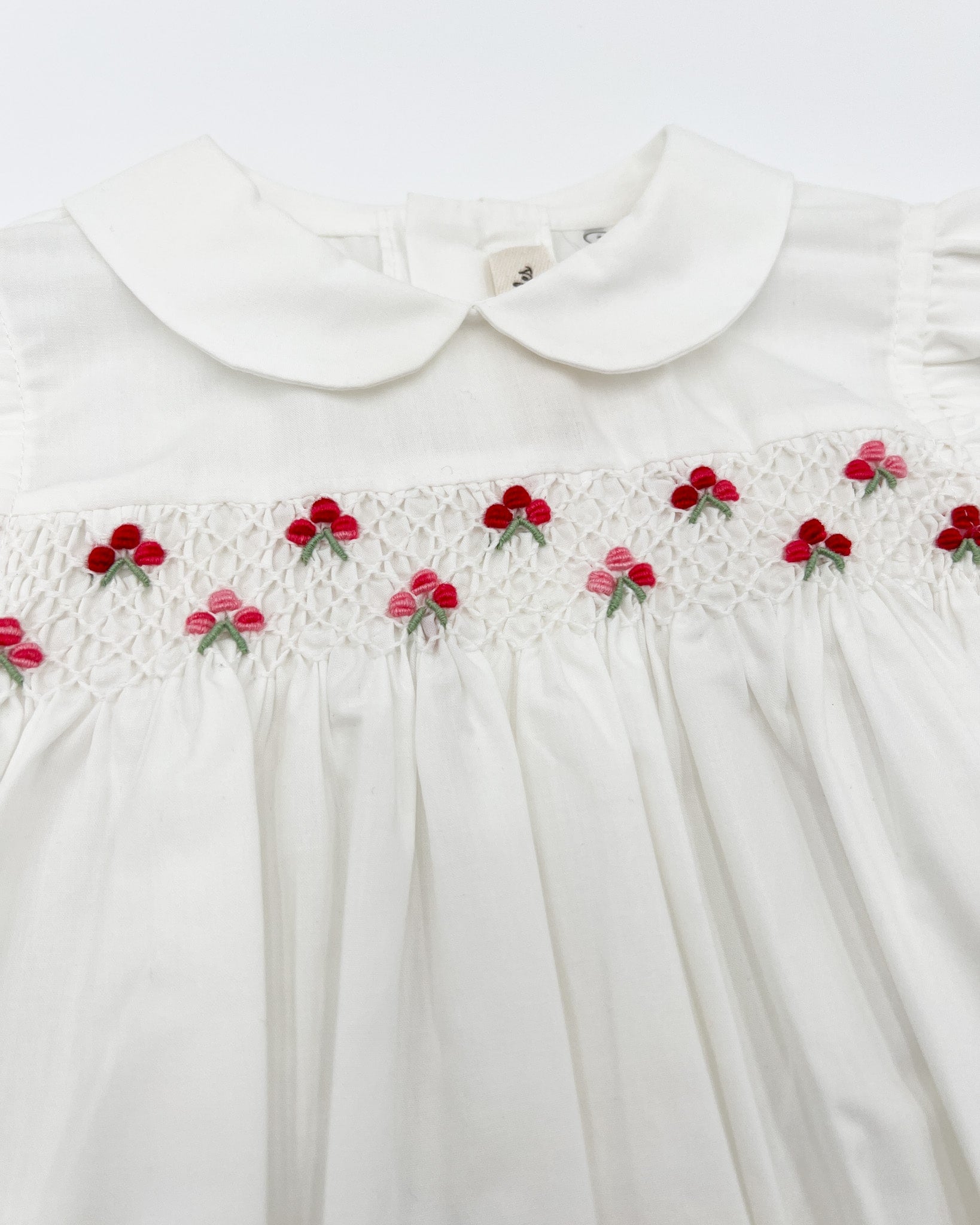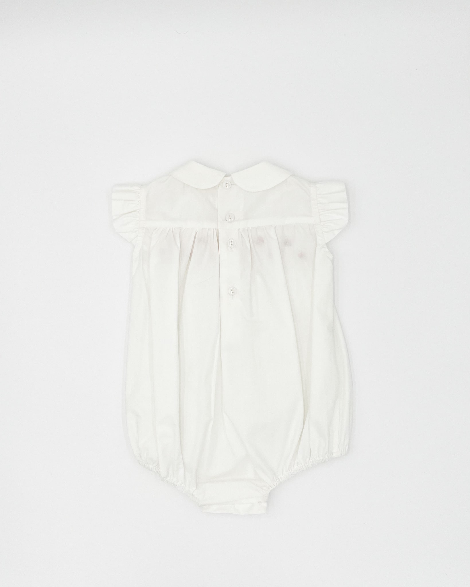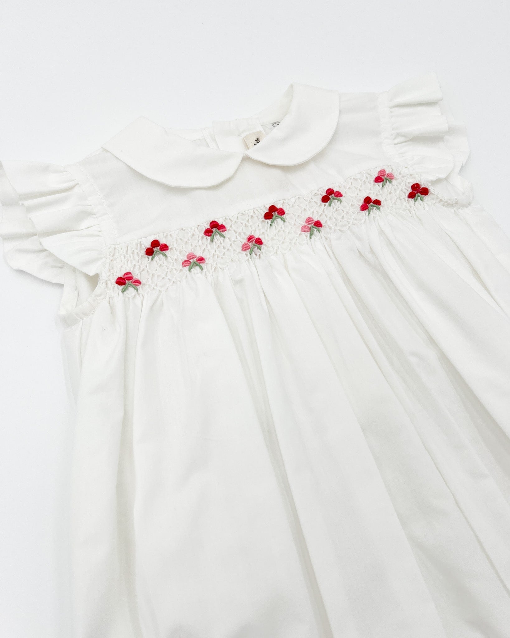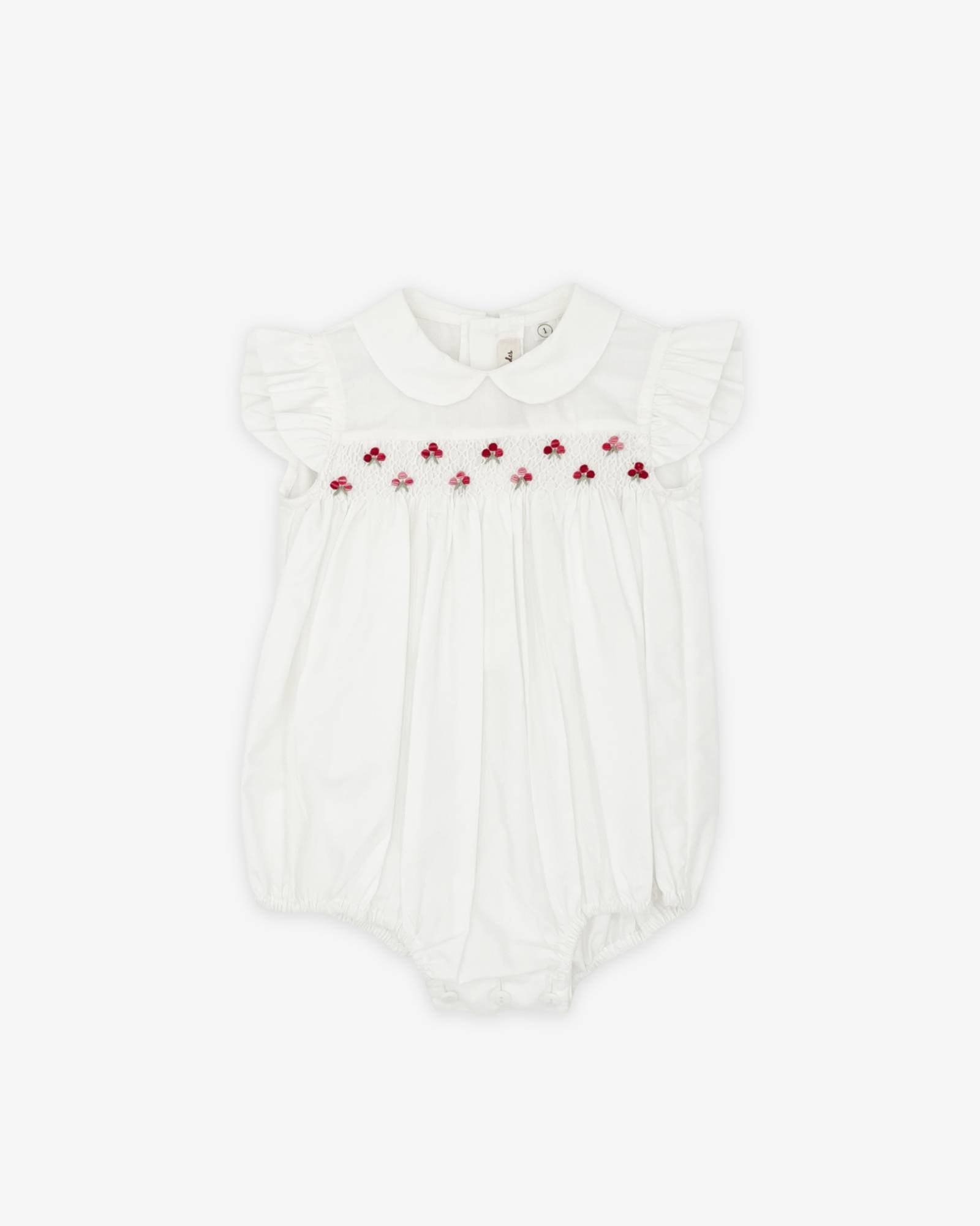 White smocked romper with a hand embroidered red and pink floral design and peter pan style collar made of high quality polycotton.