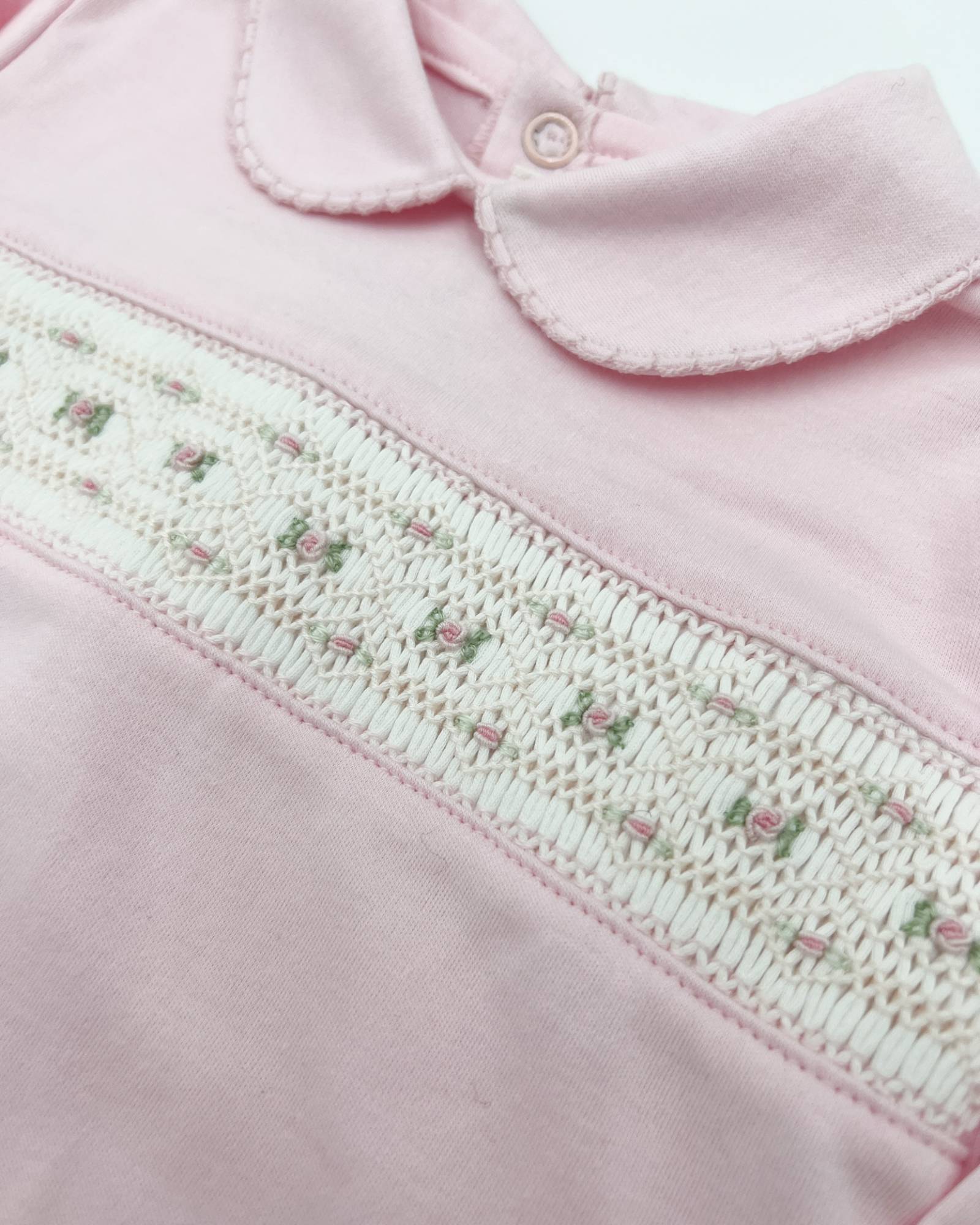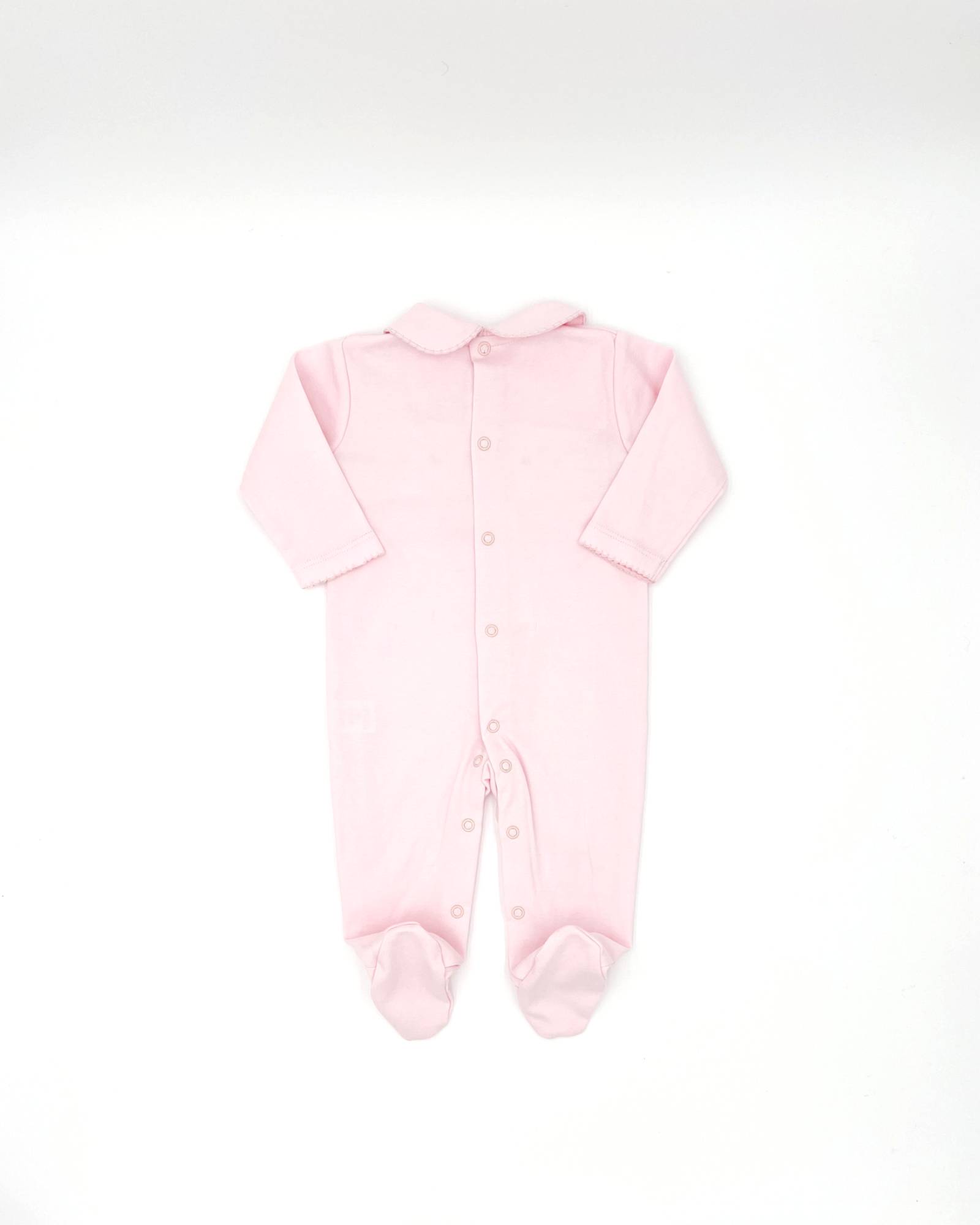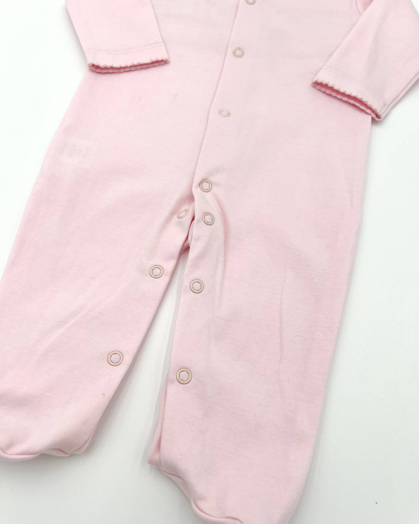 Crafted from 100% Pima cotton in Peru, this pink baby pajama features a beautiful, hand-embroidered floral pattern. Available from 0 - 9 months.