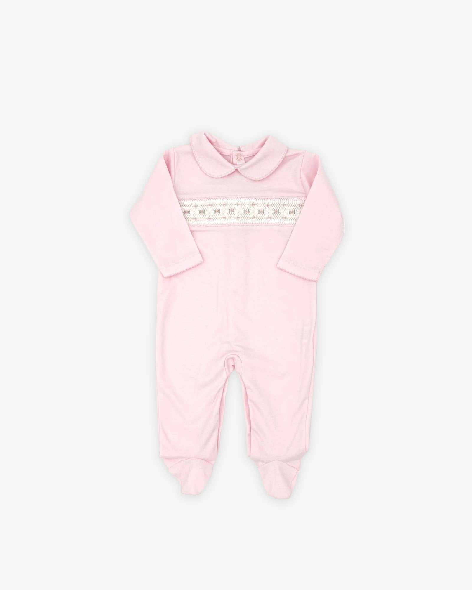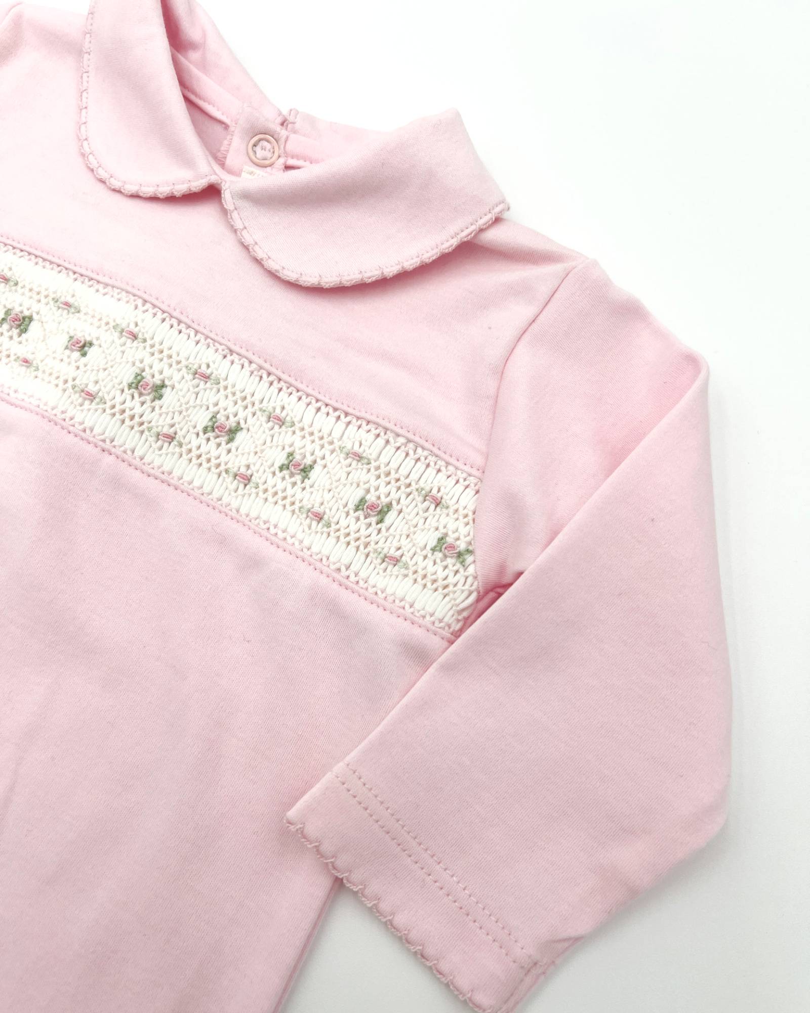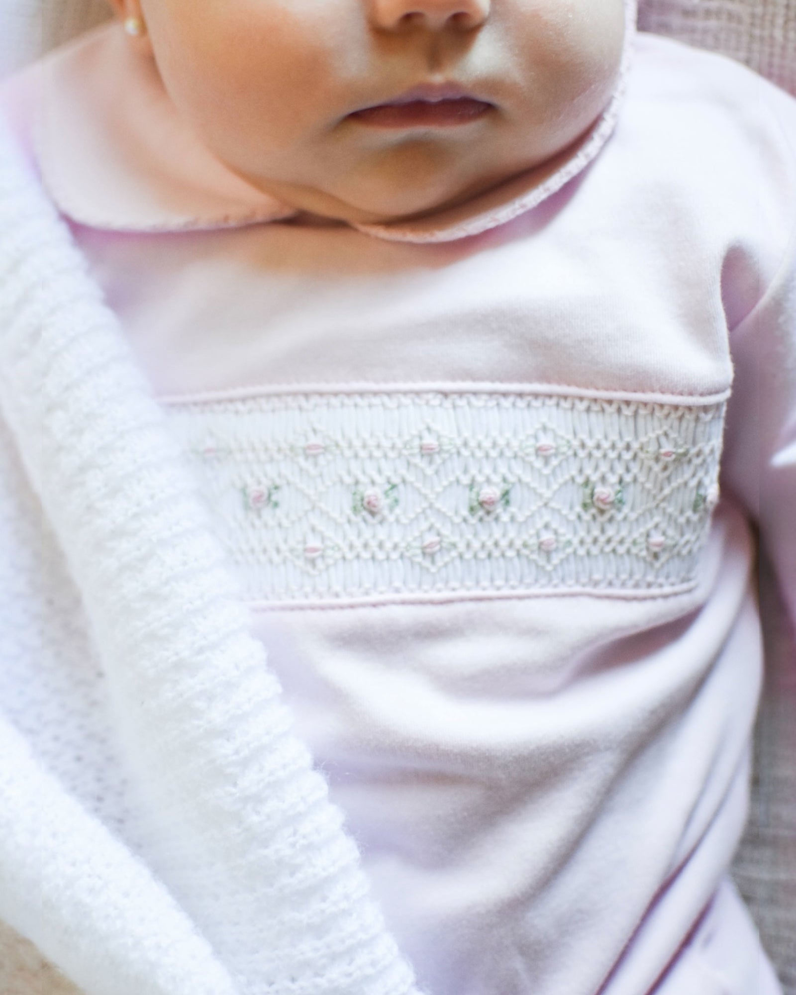 Crafted from 100% Pima cotton in Peru, this pink baby pajama features a beautiful, hand-embroidered floral pattern. Available from 0 - 9 months.
