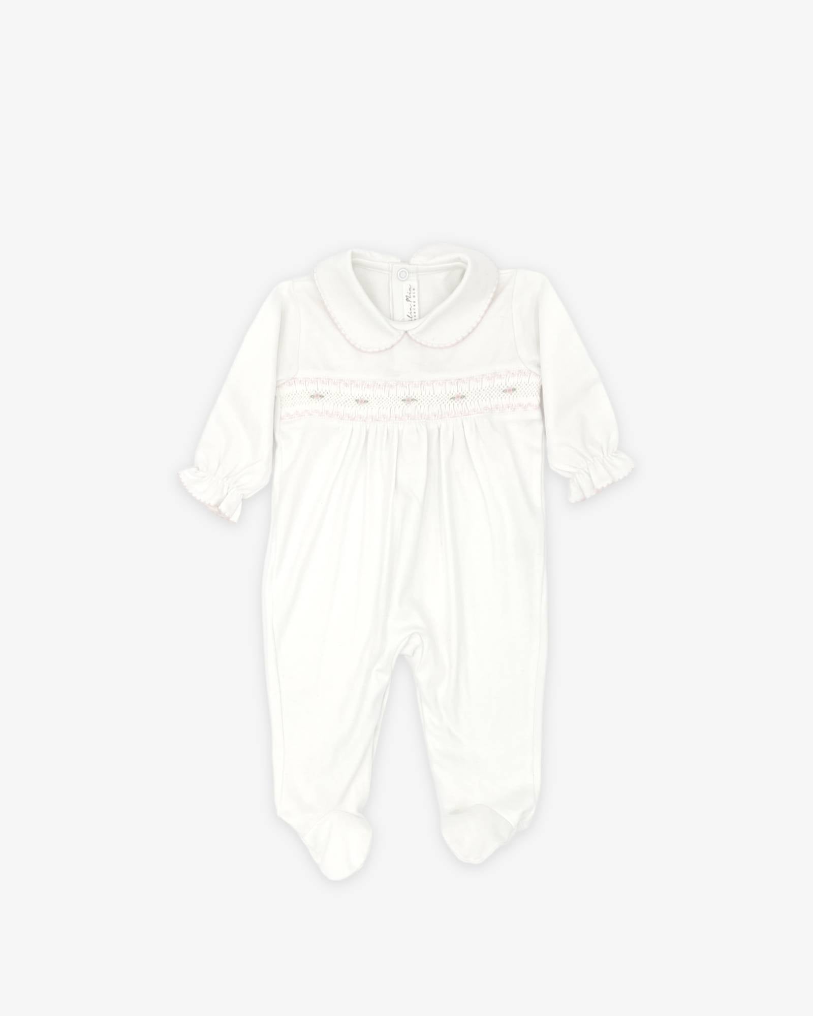 Crafted from 100% Pima cotton in Peru, this white baby pajama features a delicate, hand-embroidered pink floral pattern. Available from 0 - 9 months.