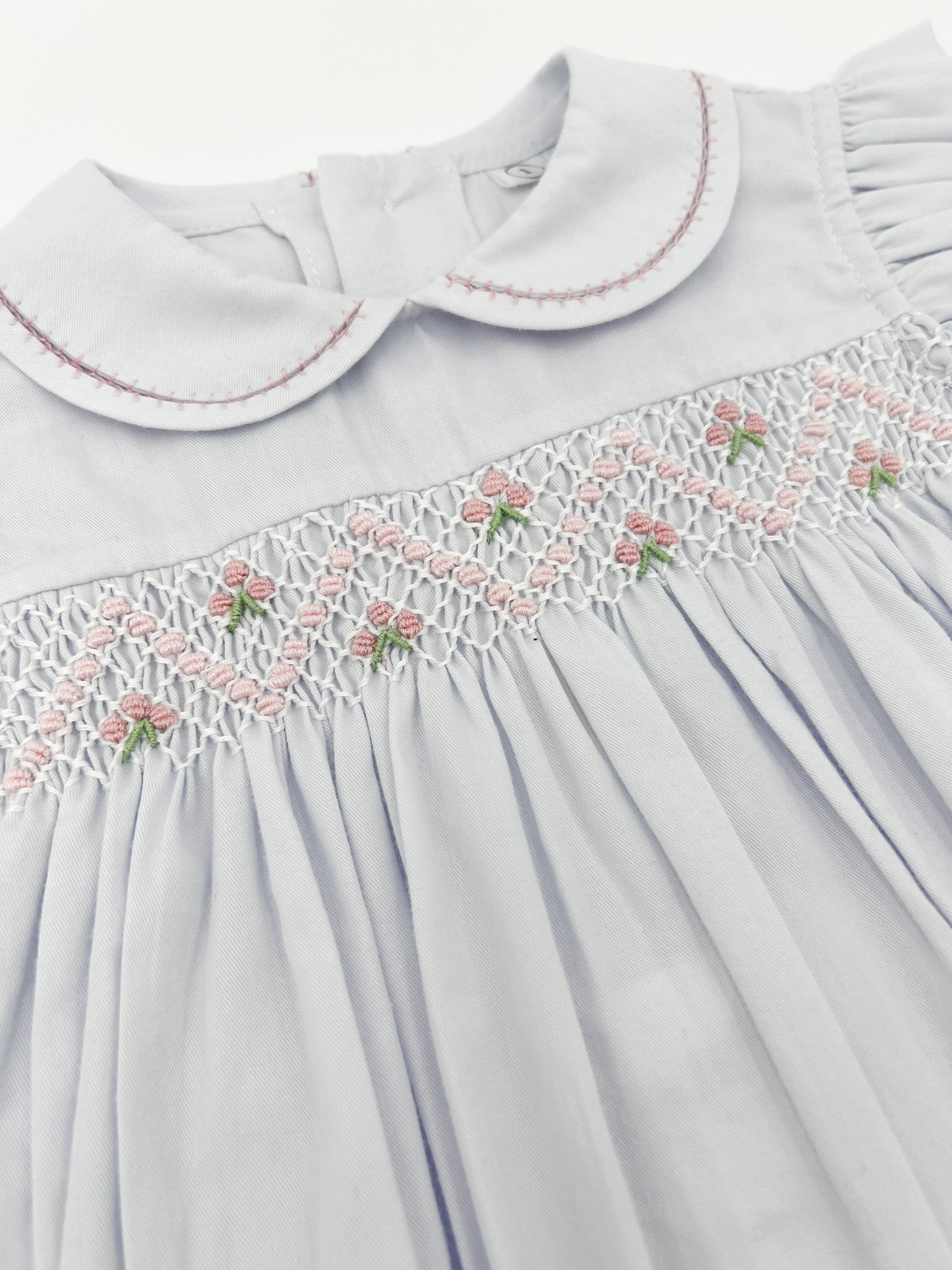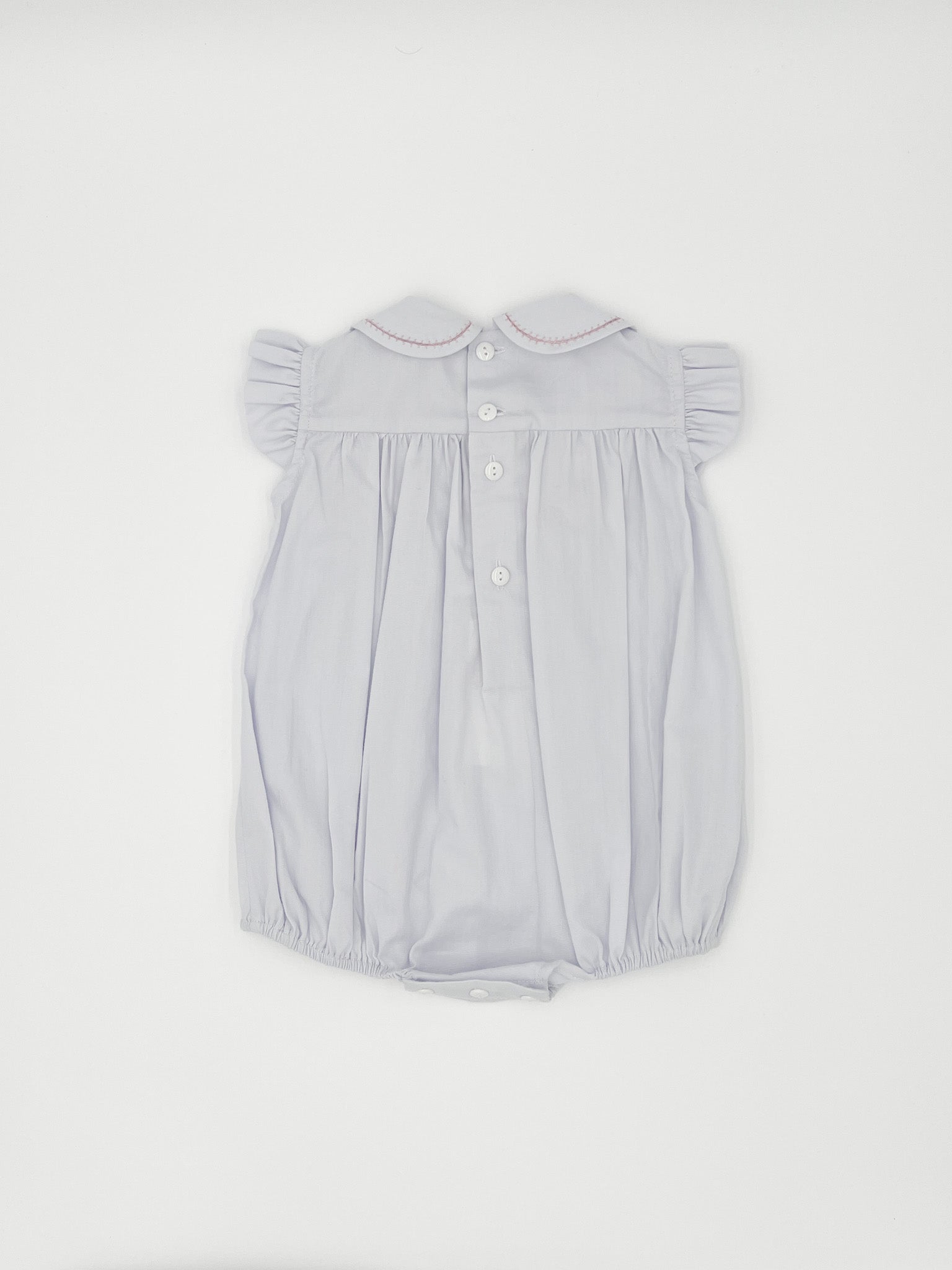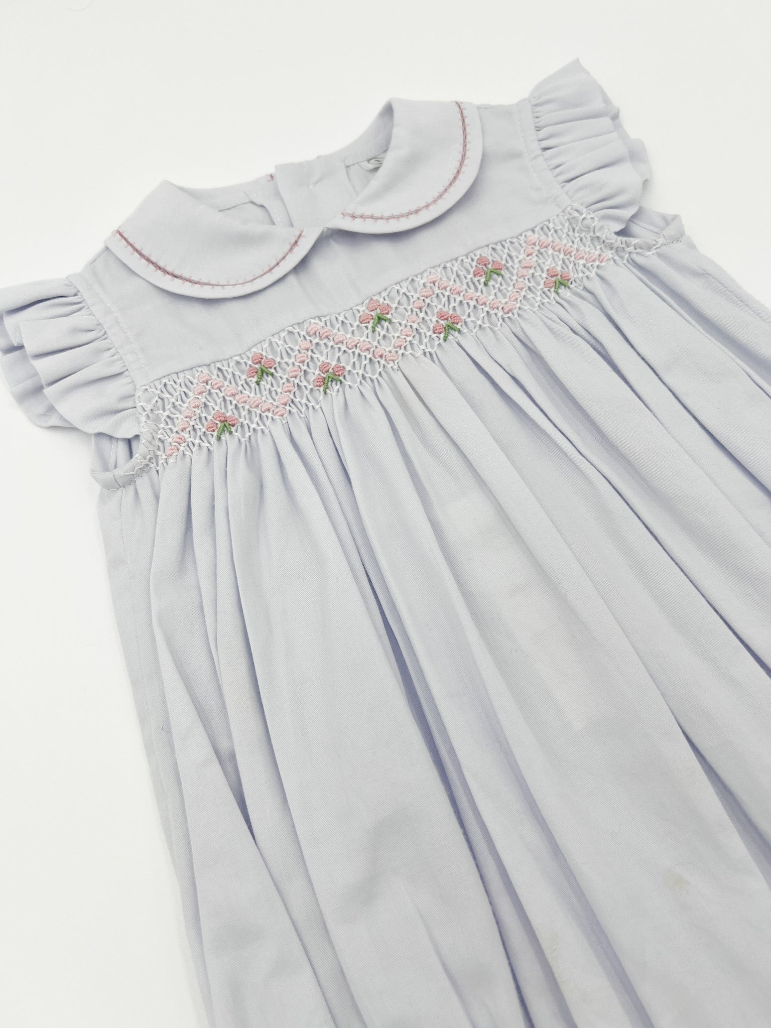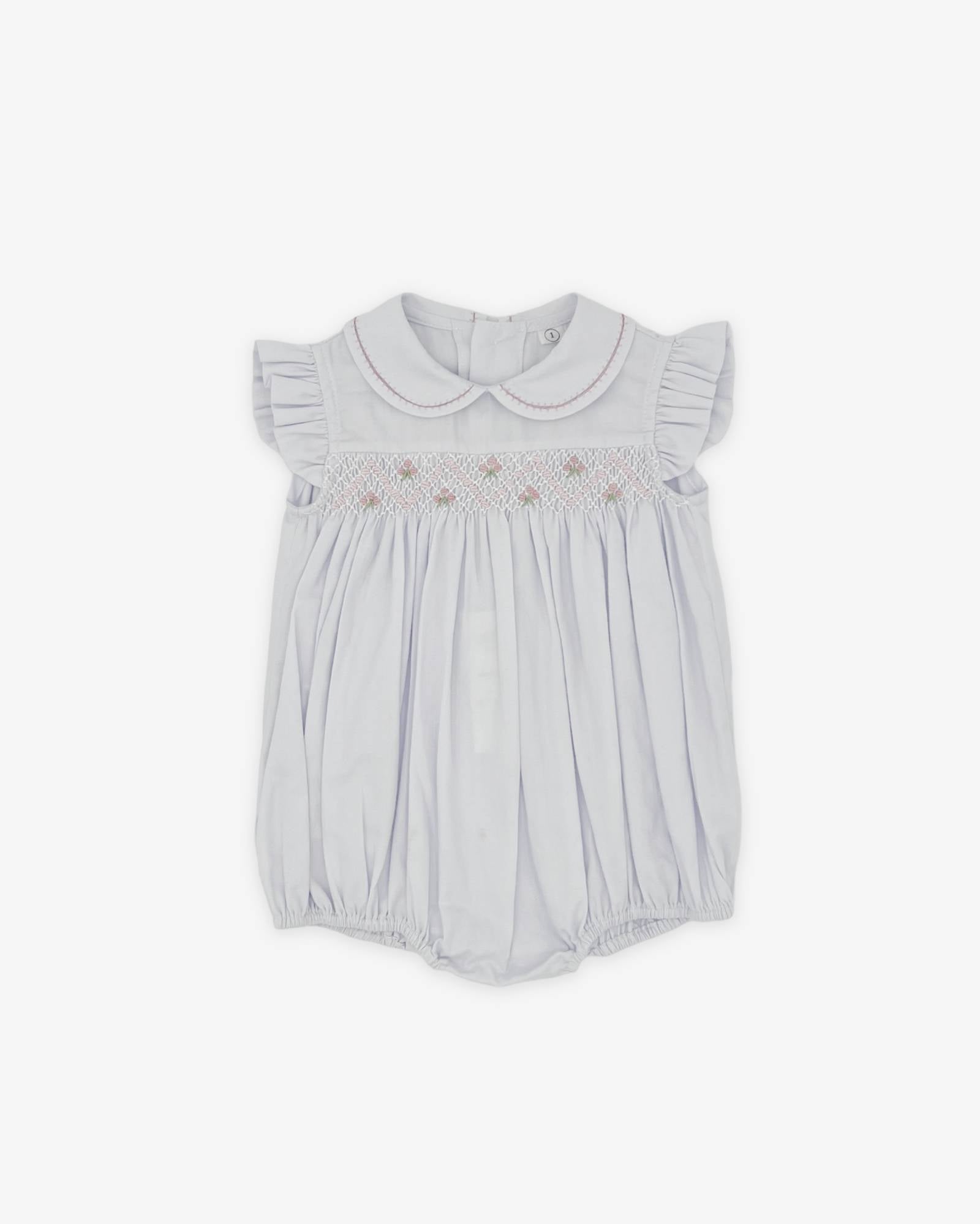 Violet smocked romper with a hand embroidered pink floral design and peter pan style collar made with high quality polycotton.