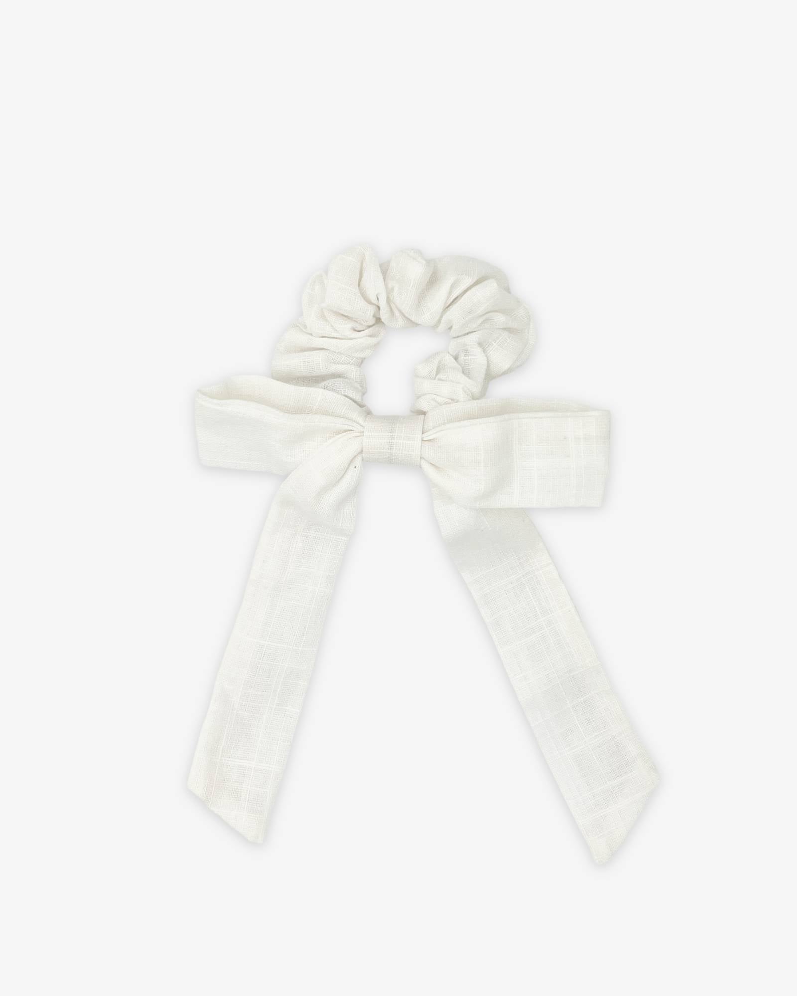 White scrunchie with bow made of 100% cotton, perfect for matching with any outfit.
